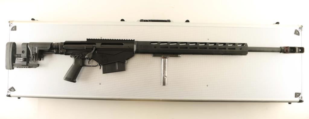 Magazine fed bolt action target rifle chambered in .338 Lapua Magnum, manufactured in Newport, NH circa 2019. Features a type III black hard coat anodized finish, heavy contour 26” cold hammer forged chrome-moly steel barrel with 5R rifling, tunable muzzle brake, factory installed 30 MOA optic rail, nitrided three-lug bolt with 70 degree throw & replaceable oversized knob, Marksman Adjustable trigger, Accurate-Mag 5 round AI pattern magazine, ambidextrous manual safety, 18” aluminum free-float handguard with M-LOK attachments points at the 12, 3, 6 & 9 o’clock positions, AR style pistol grip and MSR left-side folding shoulder stock adjustable for comb height & length of pull. Includes literature, a spare magazine, QD cup, M-LOK rail segment and a custom tripod with mount. Also includes an aluminum case. Rifle retains approximately 98% of its original finish showing minor handling marks and wear. Action is smooth, the bore is pristine and the synthetic components are fine. Condition is near NRA Excellent. ***Modern Firearm***