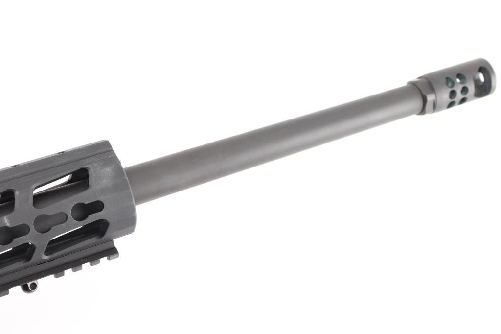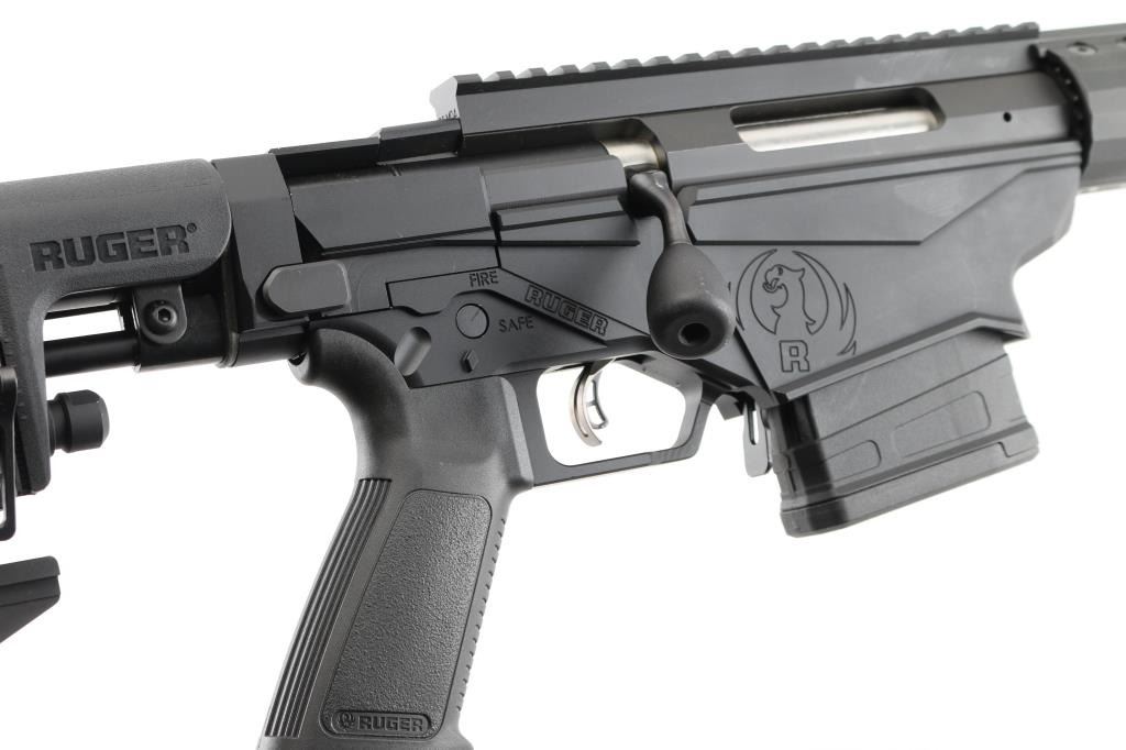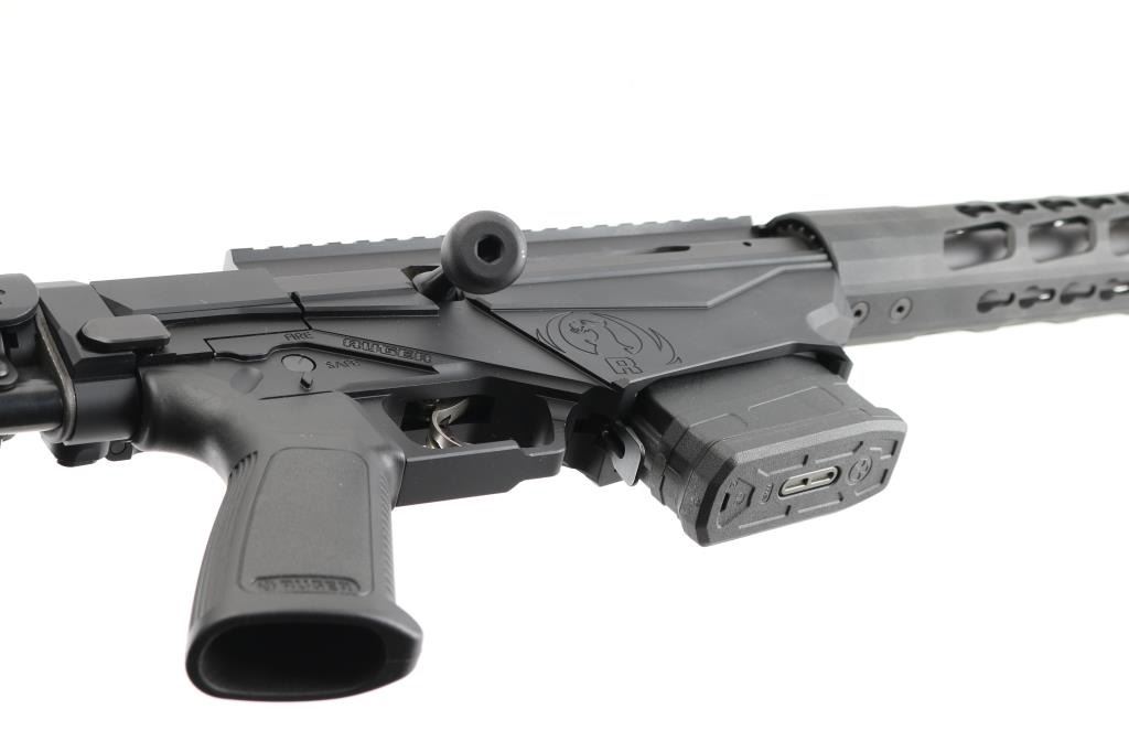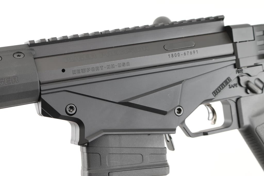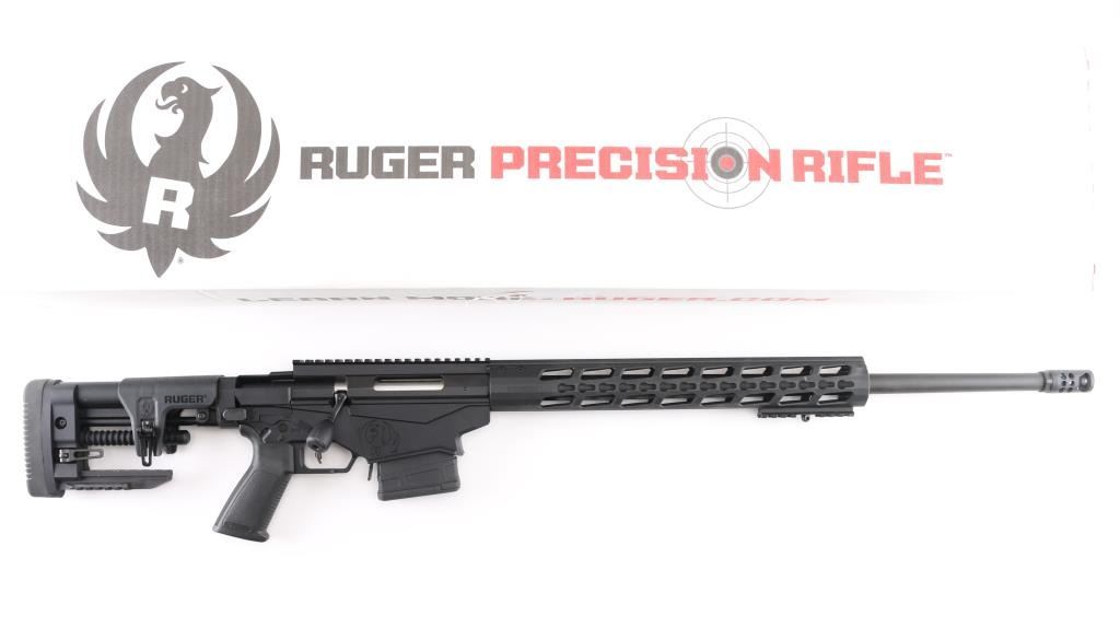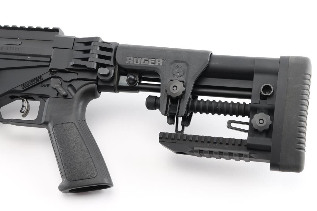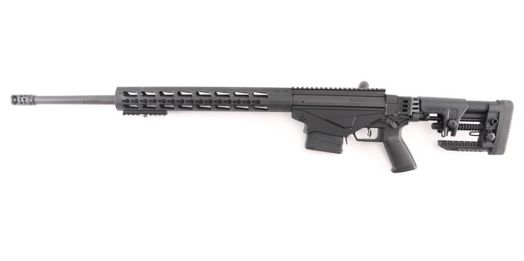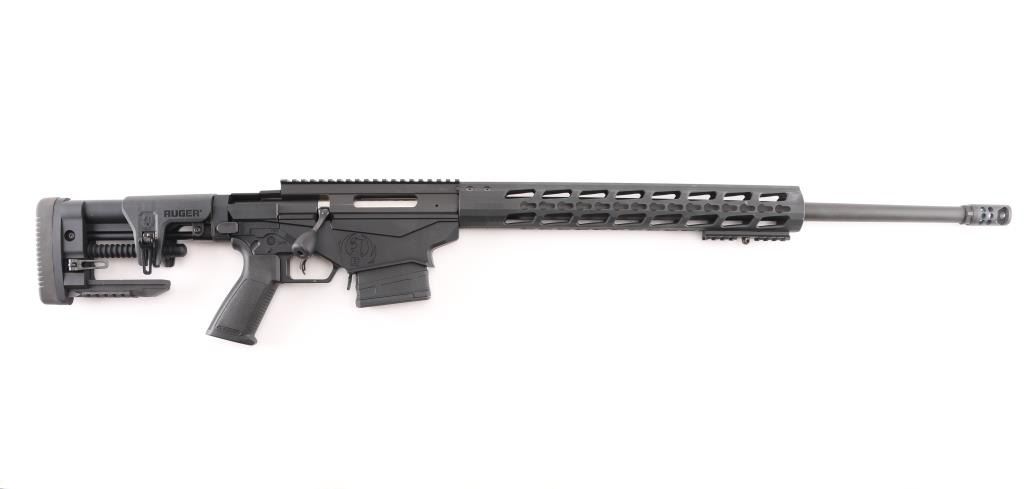 SN: 1800-676. Optics ready. Magazine fed bolt action target rifle chambered in 6.5 Creedmoor, manufactured in Newport, NH circa 2017. Features matte black finish, heavy contour 24” barrel with ported muzzle break, three-lug bolt with 70 degree throw & oversized knob, Marksman Adjustable trigger, accepts AI pattern magazines, one 10 rd magazine provided, manual safety, 15” aluminum free-float key-mod handguard, Picatinny rail section with sling stud attached to handguard at 6 o'clock position, AR style Ruger pistol grip, Ruger left-side folding shoulder stock adjustable for comb height & length of pull, rubber recoil pad.. Bore is excellent. Retains 99% finish. Comes in original factory box, with documents/manual, lock, and spare 10 rd magazine (*2) total. Condition is NRA Excellent. Modern Firearm.