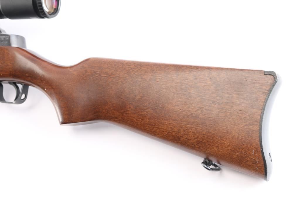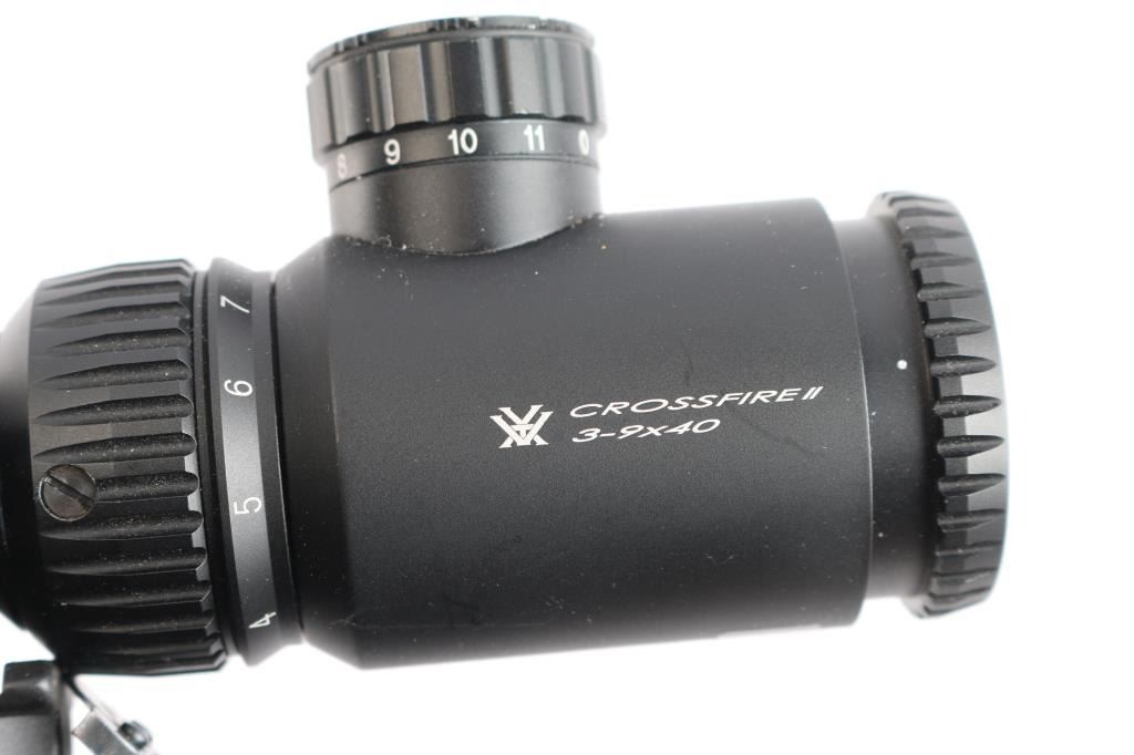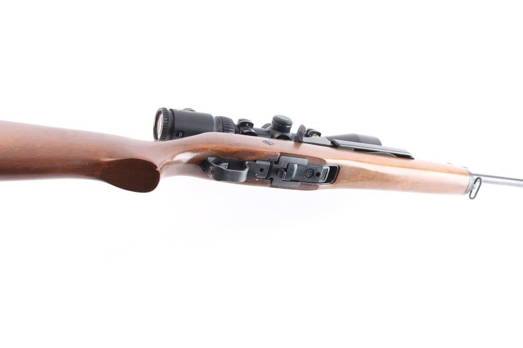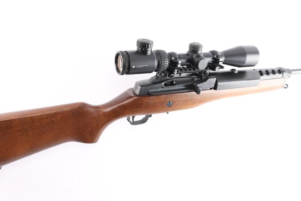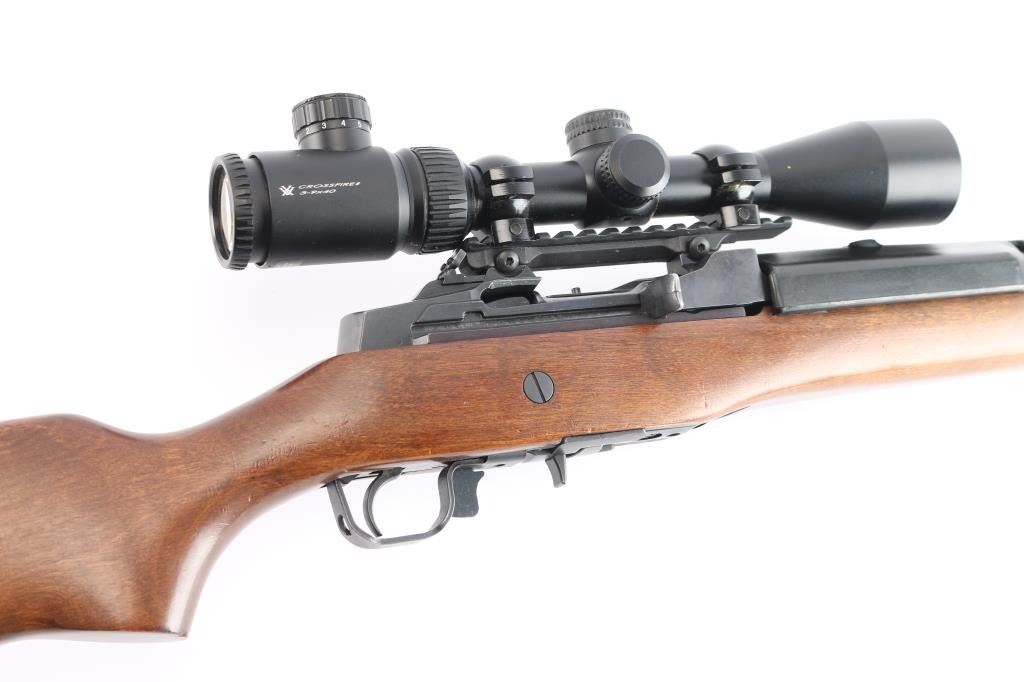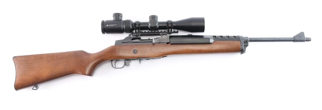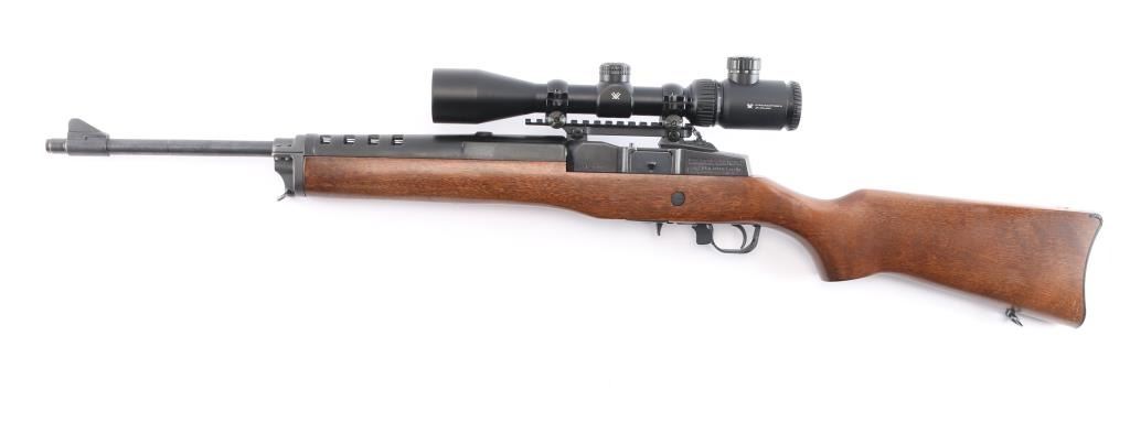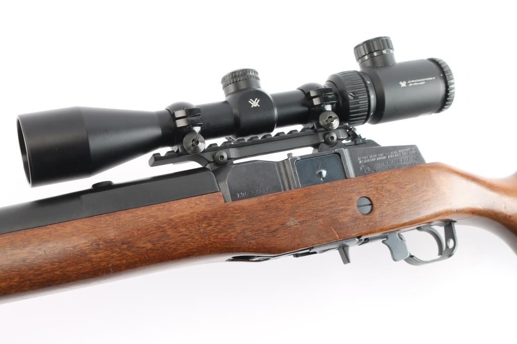Semiautomatic rifle features blued finish, smooth wood stock, black polymer handguard, 18" barrel, large blade front sight, folding adjustable peep rear sight, manual safety, sling swivels, plastic butt plate, dovetail scallop cuts on top of receiver with scope rail installed. Mounted with a Vortex Crossfire II 3-9x40 scope, duplex reticle, clear optics. Bore is excellent/bright. Retains 95% blued finish with handling wear. Stock is near excellent with few scratches. Includes (1) Ruger 5 round magazine.