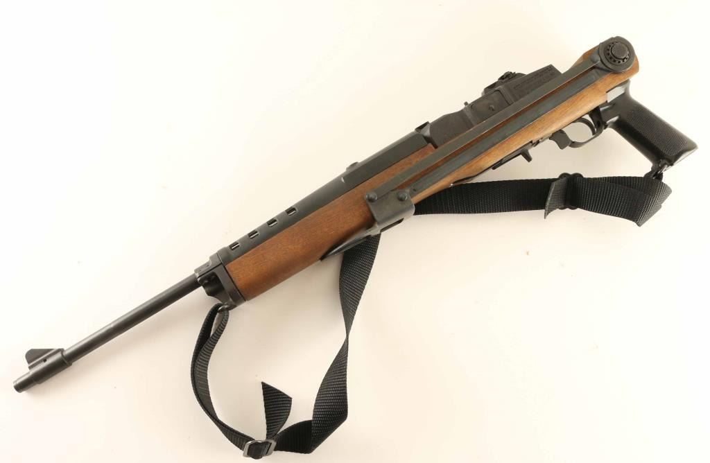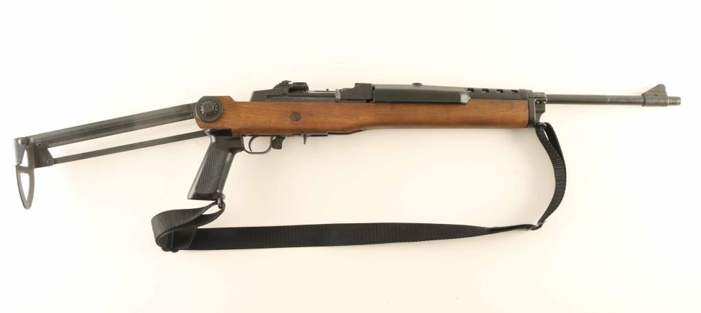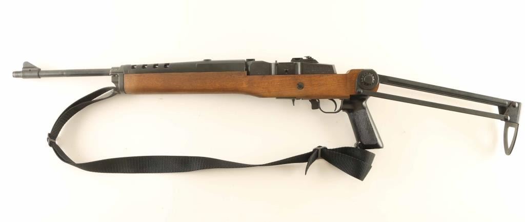 Semiautomatic rifle chambered for .223 Remington. Features approx 18.5 inch barrel, folding rear peep sight, black plastic handguard, sling swivels. Accepts detachable magazines (not included). Mounted in under folding stock with wood chassis, steel folding arms and skeletonized buttplate, plastic pistol grip. Bore is in excellent condition; needs cleaning. Retains over 95% original blue, with bare metal rub mark on top of bolt from operation. Stock is excellent. Includes black nylon sling. Condition is NRA Excellent ***Modern Firearm***