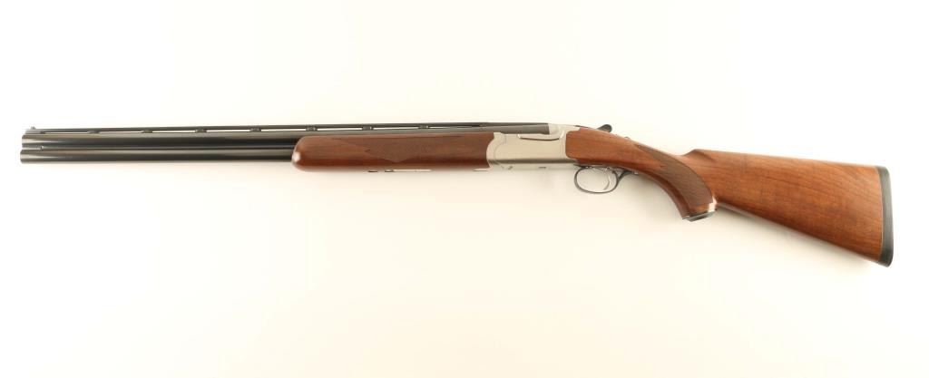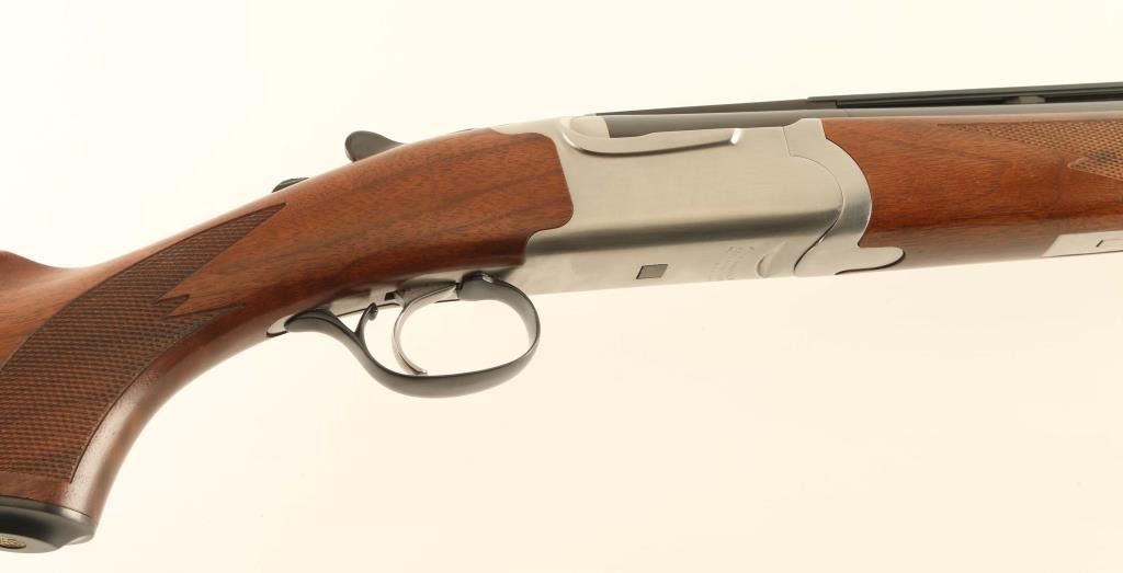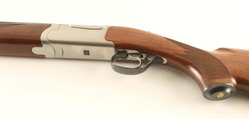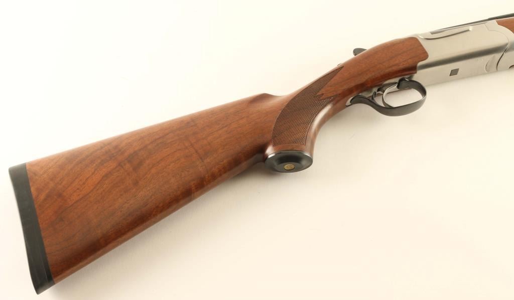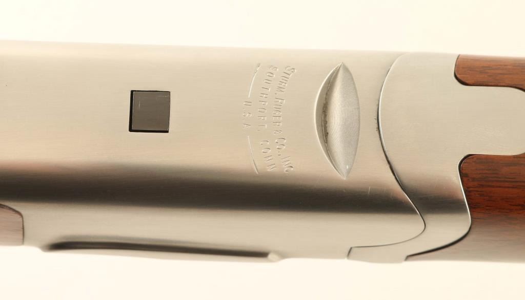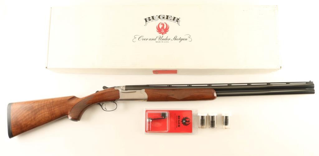Quality American made over/under double barrel box-lock shotgun chambered for 3” or shorter 20 gauge shells, manufactured circa 1994. Features blued 26” barrels with ventilated sighting rib & removable cylinder/cylinder chokes, selective automatic ejectors, white bead front sight, smooth single trigger, sliding tang safety/barrel selector, brush finished stainless steel receiver, serrated top lever, point checkered American Walnut forend with inlayed brass Ruger medallion, and semi-fancy figured walnut semi-pistol grip shoulder stock with metal grip cap & black factory recoil pad. Stock dimensions: drop at comb 1 5/16”, drop at heel 2 1/4” and length of pull 14 1/8”. Includes the original factory cardboard box with choke tools and three additional chokes (full, improved modified & modified). Shotgun retains nearly all of its original finish showing minor handling marks/superficial scratches with no major wear observed. Action is smooth & on face, the bores are pristine and the wood stocks are extra fine. Condition is like NRA Perfect in box. ***Modern Firearm***