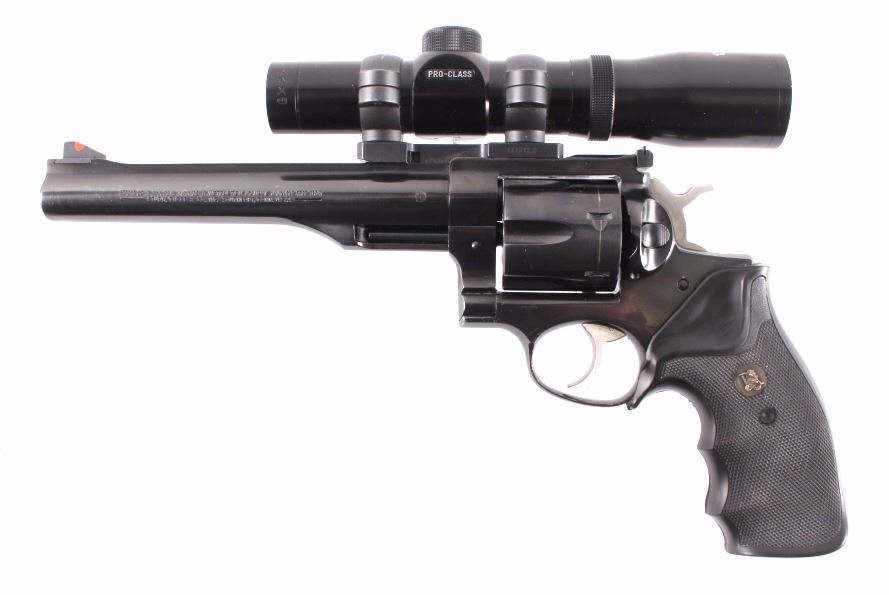 This is a Ruger Redhawk double action revolver chambered in the .44 Magnum caliber with a Tasco Pro-Class 3x32 scope. The revolver features a blued frame, cylinder and 7.5" barrel with rubber Pachmayr grips. The barrel is marked "Sturm, Ruger & Co. Inc. Southport, Conn. U.S.A." and ".44 Magnum Cal.". The frame is marked "Ruger Redhawk". The revolver shows good condition with 95% original finish. It measures 13" long with a 7.5" barrel. Serial number is 501-59787. This is a modern manufactured handgun and requires NICS background check or FFL transfer.