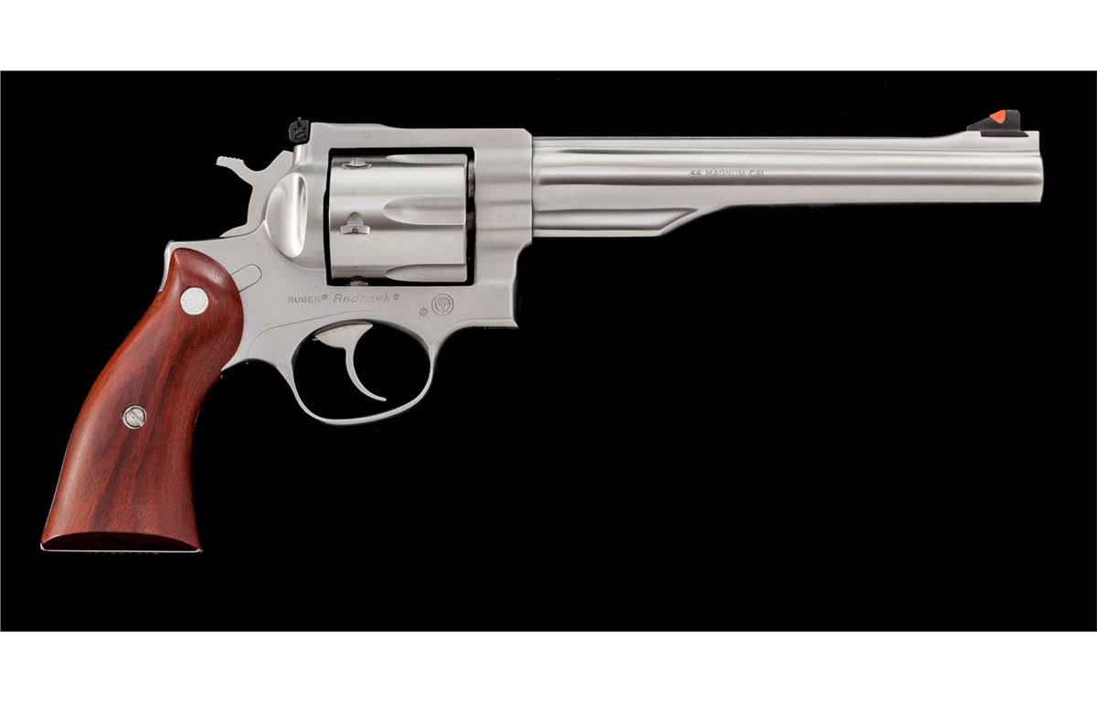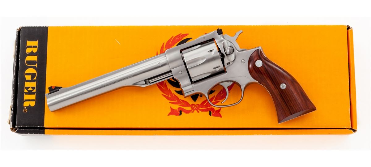 Ruger Redhawk Double Action Revolver, #500-28321, .44 mag. cal,., 7-1/2'' barrel, stainless steel, factory walnut grips. Condition is excellent, appearing near new, in original box. Est.: $500-$750. (Modern/PPT)