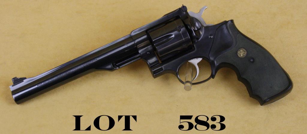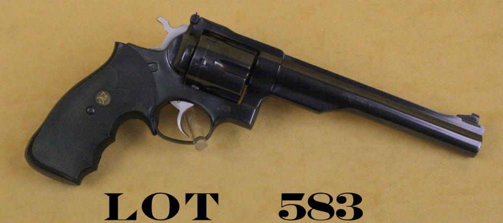 Ruger Redhawk Model DA revolver, .44 Mag. cal., 7-1/2” barrel, blue finish, Pachmayr combat checkered hard rubber grips, #501-66701. This gun is in overall good condition showing a quality re-finish,possibly factory, good bore and action, modified front sight, good grips. Est.: $300-$500.