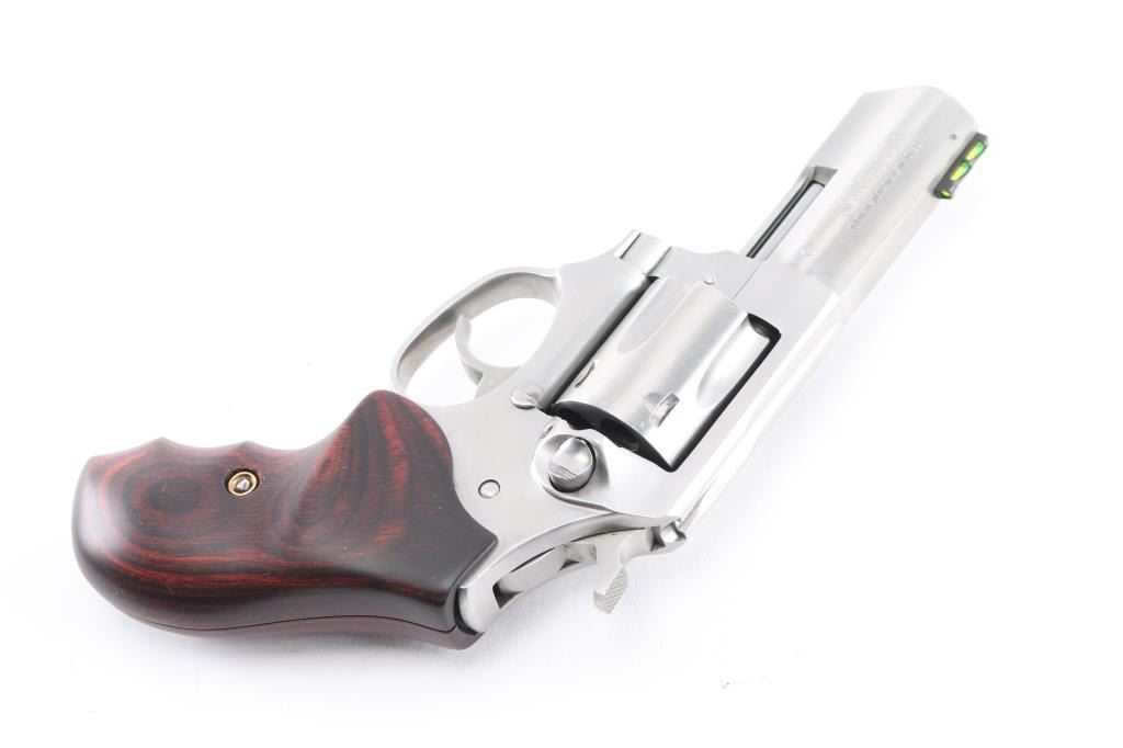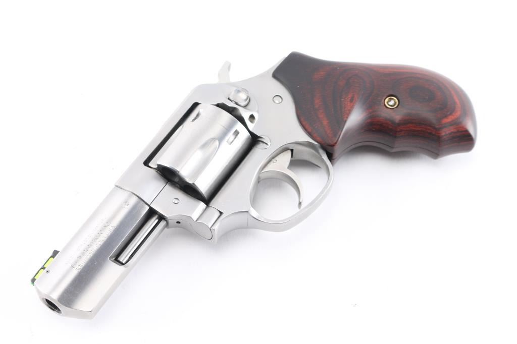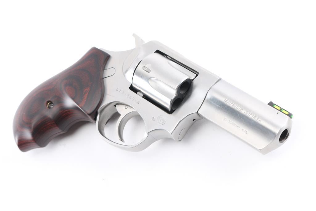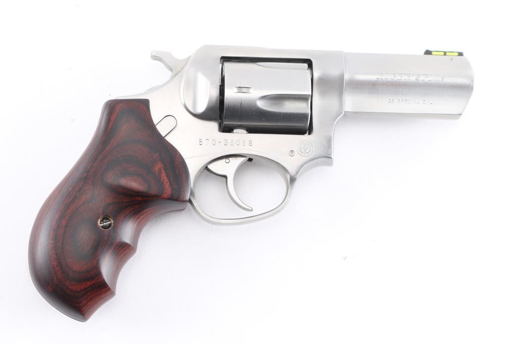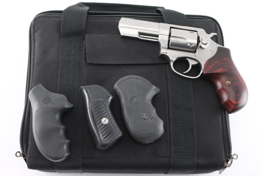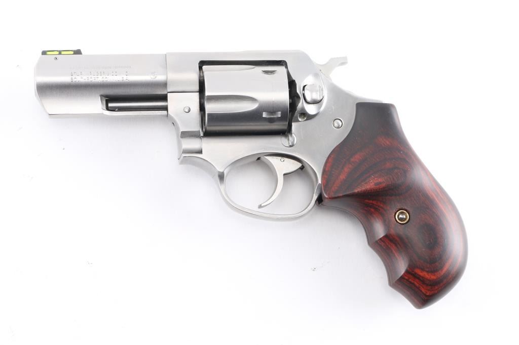 Double action revolver features stainless steel construction, 3" full lug barrel with green fiber optic front and fixed notch sights, 5 shot fluted cylinder, laminated smooth, finger grooved rosewood grips. Bore and chambers are excellent condition, grips are fine, stainless finish has a few minor scratches. Action is crisp/smooth. Includes nylon covered hard case with 4 extra springs, original Ruger factory grips, and a Hogue and Pachmayr hard rubber finger grooved grips and 2 speed loaders in nylon belt pouch..Condition is NRA Very Good. Modern Firearm.