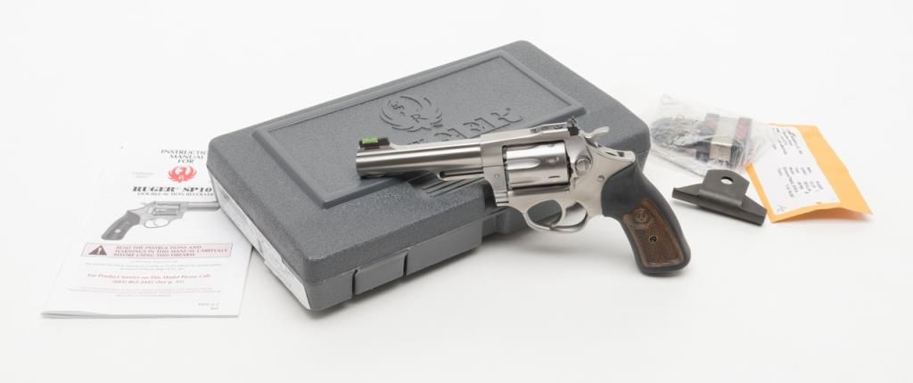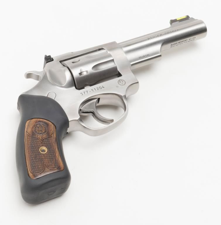 Ruger SP101 double action revolver, .22LR with a satin grey finish, 4 1/4" barrel, adjustable rear sight and a light gathering front sight, serial number 577-11204. This revolver is in like new condition showing little handling with originalRuger case along with instruction manual, lock and casing. Est.: $200-$400