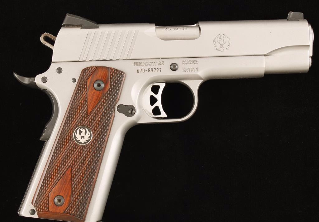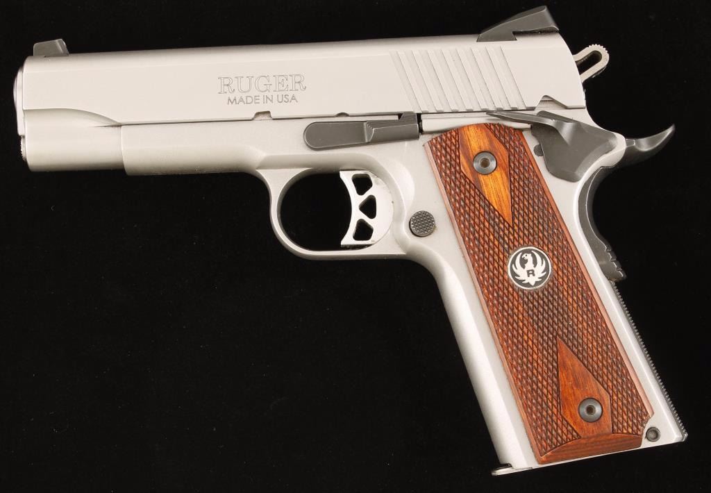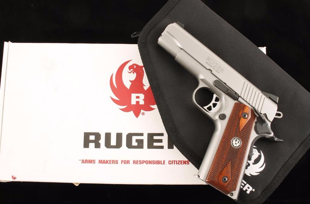 Stainless steel single action semi-automatic pistol chambered in .45 Automatic. Features a low glare finish, 4.25" steel barrel, Novak three dot adjustable sights, skeletonized trigger & hammer, thumb safety, beavertail grip safety, 7 round magazine and double diamond checkered Ruger medallion grips. Includes original box, soft case, extra magazine and lock. Finish shows little to no use. Action is strong, bore is excellent and grips are fine. Condition is excellent. ***Modern Firearm***