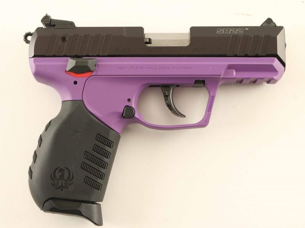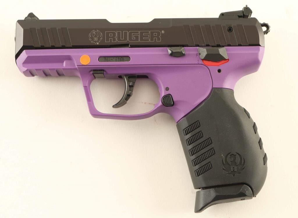 Pistol, Semi-automatic. 10+1 capacity. Small, light-weight pistol. Black anodized slide, with 3-dot adjustable sights. Purple polymer frame, with black rubber grips. Over-sized triggerguard, and accessory rail. 3.5 stainless steel ramped barrel attached to the frame. Double/single action.. Ambidextrous safety, and magazine release. Bore is excellent/bright. Action is crisp/tight. Pistol is in almost new condition in original Ruger box. Comes with two 10-rd magazines with finger extensions. Spare grips, safety lock, soft, black nylon case and manual. NRA Condition-Excellent. Modern Firearm.
