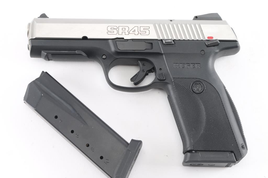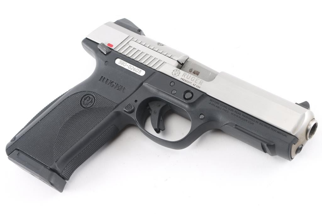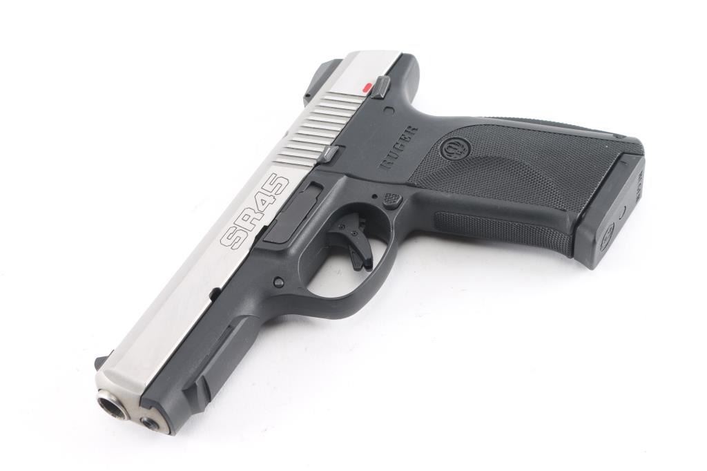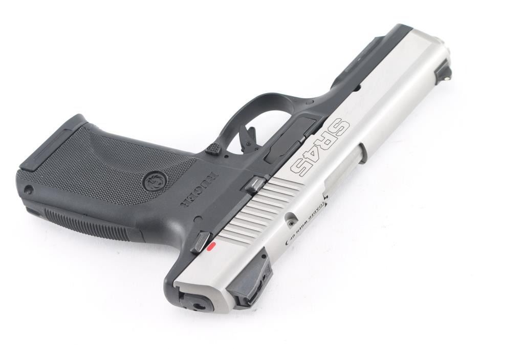Semiautomatic pistol features two tone finish with stainless slide & black polymer frame, 4.375" barrel, three dot sights with adjustable rear sight, manual safety in trigger, loaded chamber indicator, striker status indicator, lanyard attachment point at butt, replaceable backstrap, ambidextrous manual safety, ambidextrous push button mag release, accessory rail on dust cover. Bore is very good condition. Overall external condition is excellent, with minor handling marks, partial finish loss on blued slide stop. Includes two magazines.