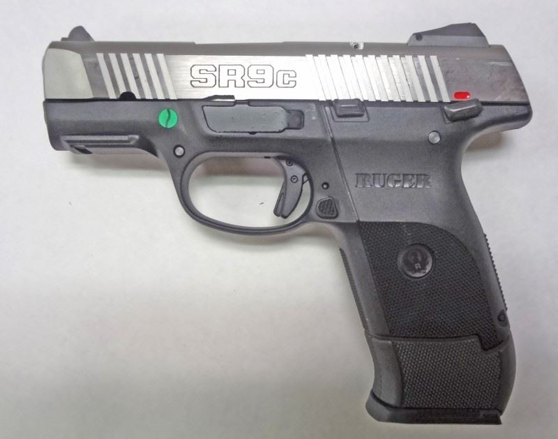 Ruger SR9C 9MM. Semi-automatic pistol. Brushed stainless finish; polymer frame; compact; black synthetic grips; capacity: 17+1; 2 magazines; adjustable 3-dot sights; reversible backstrap; glass-filled black nylon frame; accessory mounting rail. EST:$500-$550
