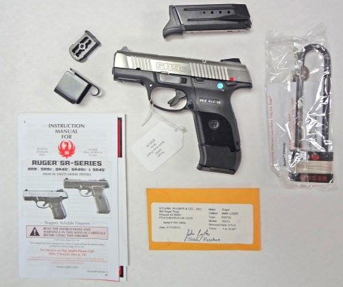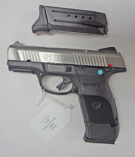 Ruger SR9C Compact Model KSR9C Semi-Auto Pistol 9MM. Finish-brushed Stainless Slide, Action-Double Action Only (Striker Fire Action), Stock-Blk, High Performance Glass-Filled Nylon Frame, Capacity-10+1 & 17+1, # of Mags-2, Safety-Ambidextrous Manual, Mag Disconnect, Sights-Adjustable 3-Dot Sights, FT:Raked Forward, Barrel Length-3.5", Overall Length-6.85", Weight-23.4 oz, Packaging-Mag Loader, Black Plastic Case, Features-Reversible Backstrap (Flat or Arched), Accepts Most Full Sized SR9 Mags, Receiver-Picatinny Rail. EST. $530-580.