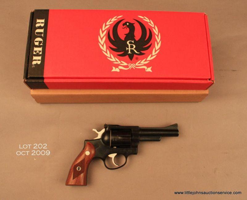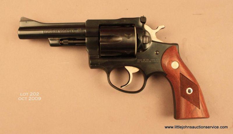 Ruger Security Six, #152-15411, .357 Mag, 4" barrel, adjustable sights, blued finish, checkered walnut diamond medallion grips. Revolver is in excellent condition overall, and appears to have been used scarcely, if at all.. Manufactured in1976, and marked "Made in the 200th Year of American Liberty". In it's original red Ruger box with all paperwork. Revolver is covered in a thin layer of grease. Est. $150-$300.