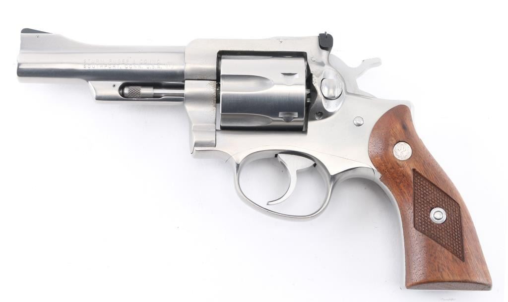 Stainless steel medium frame double-action revolver chambered in .357 Magnum, manufactured circa 1975. Features a satin stainless finish, 4" barrel with serrated sighting rib, raised serrated ramp front sight, adjustable rear sight, serrated trigger, knurled hammer spur, transfer bar safety, fluted six-shot cylinder, shrouded ejector rod and two-piece diamond checkered walnut grips with Ruger medallions. Bore and cylinders look real good, a little dirty at the muzzle. Metal finish looks very good with only minor signs of handling. Wood grips are fine. Condition is NRA Very Good *Modern Firearm*