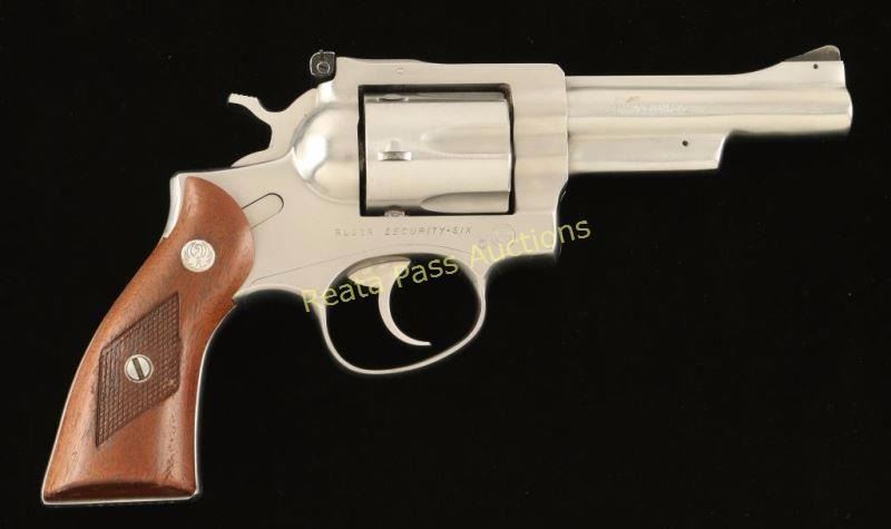 Stainless steel double-action revolver chambered in .357 Magnum, circa 1980. Features a brushed finish, 4" barrel with serrated top rib, shrouded ejector rod, ramped blade front sight, adjustable rear window sight, non-fluted six shot cylinder, smooth trigger, checkered hammer spur, two-piece Ruger medallion checkered walnut grips. Revolver shows handling marks and a drag line with no major wear observed. Action is smooth with good lock-up, bore is excellent and wood grips are good showing wear & light dings. Condition is good to very good. ***Modern Firearm***