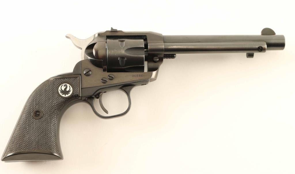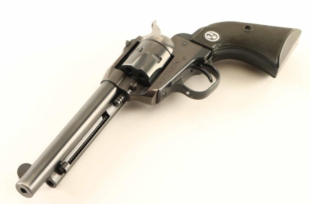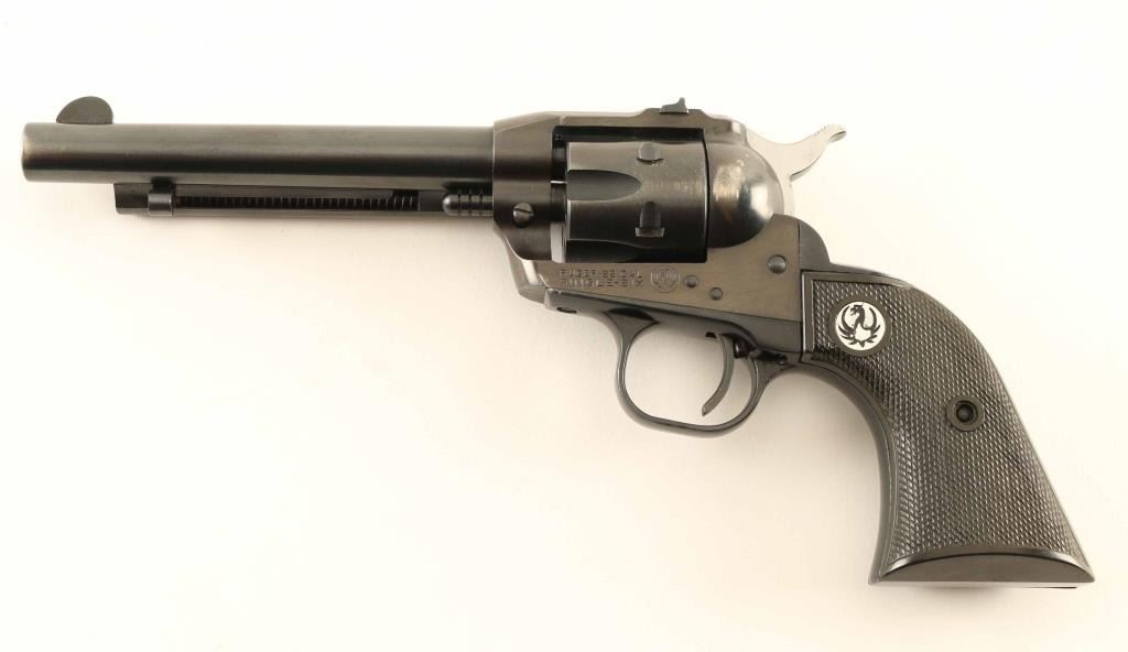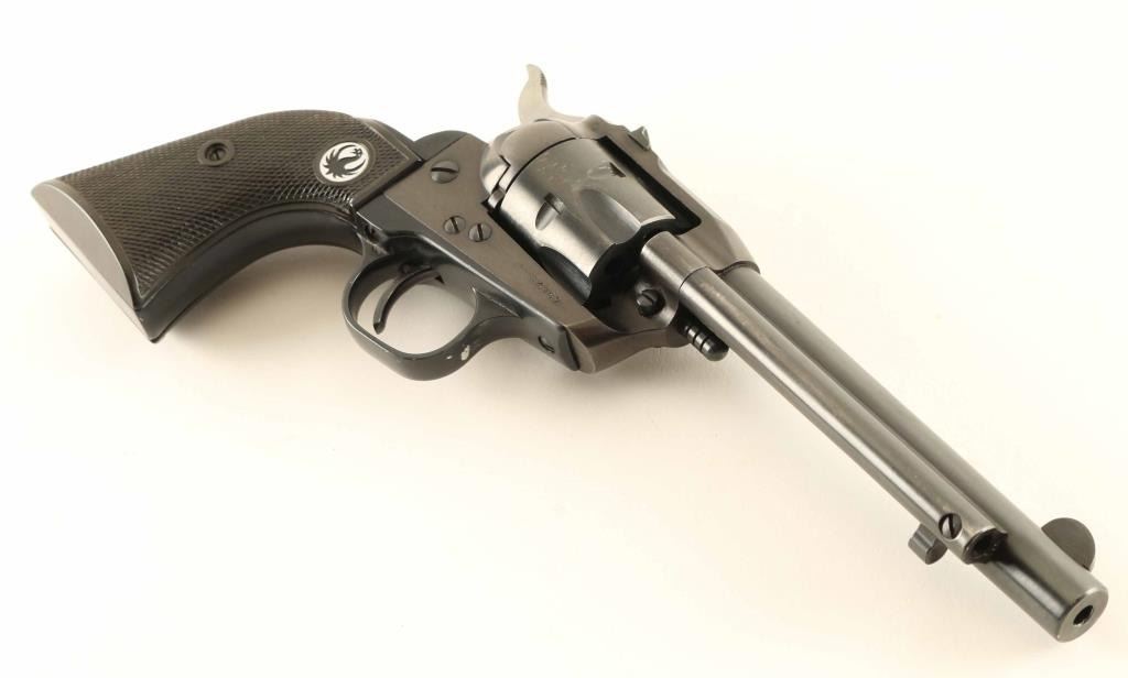 'Old Model, Three Screw' Vintage American made small frame single action revolver chambered in .22 Long Rifle, manufactured circa 1958. Features a blued/black finish, 5.5" barrel, blade front sight, dovetailed rear sight with square notch, ejector rod, smooth thin trigger, serrated hammer spur, transfer bar safety, fluted six-shot cylinder, flat-top frame, alloy grip frame and two-piece checkered black plastic grips with silver/black Ruger medallions. Revolver exhibits approximately 90% of it's original finish showing holster wear, the frame turned plum and some scattered small losses. Action is crisp with very-good lock-up, the bore is excellent and the plastic grips are very good. Condition is NRA Very Good. ***C&R Firearm***