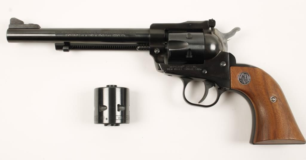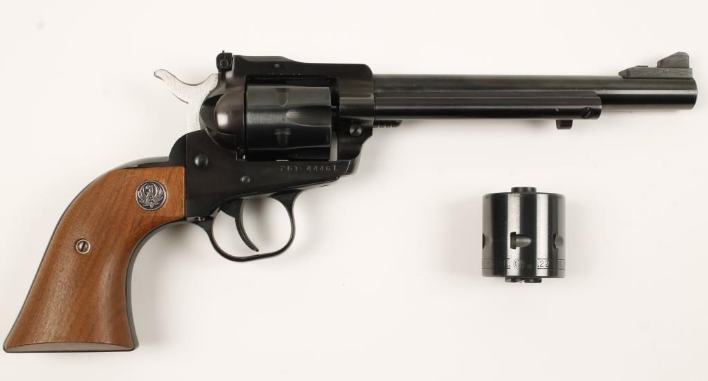 New Model single action revolver, blued with a 6-1/2" barrel. Comes in black & yellow factory box with an alternate .22 magnum cylinder included. Condition is very good. *Modern Firearm*