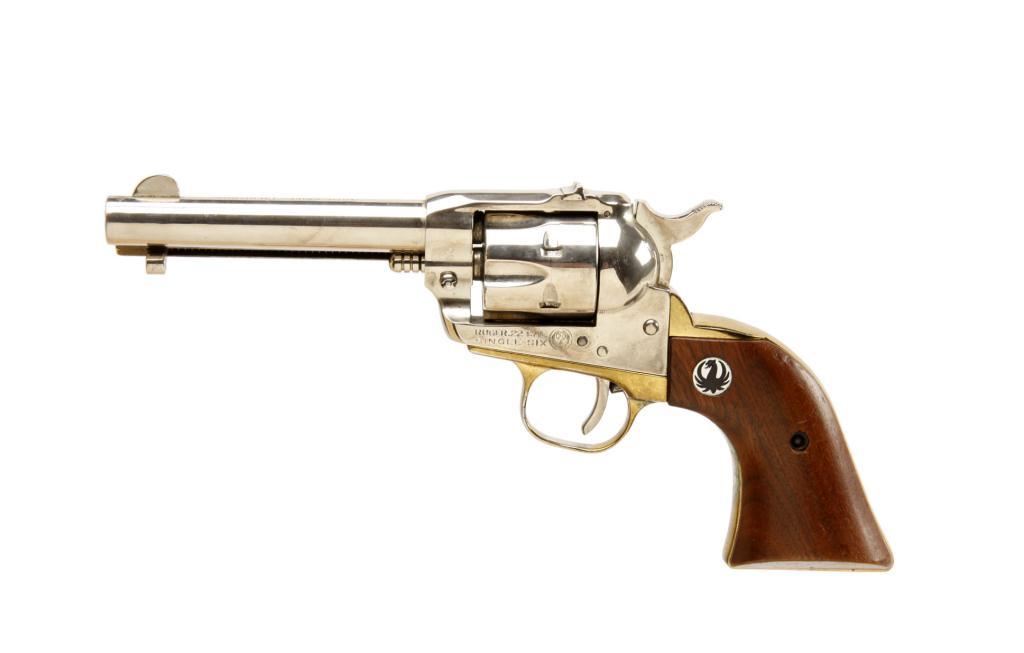 Ruger Single Six Cal .22LR SN:20-23511 Early Single Six single action 6 shot revolver without transfer bar. Nickel finish with gold wash ejector housing and grip frame, smooth wood grips with black medallions, 4 5/8" barrel with fixed sights, good bore aEarly Single Six single action 6 shot revolver without transfer bar. Nickel finish with gold wash ejector housing and grip frame, smooth wood grips with black medallions, 4 5/8" barrel with fixed sights, good bore and action.Condition: Very good to excellent with a slight deterioration to the gold wash.