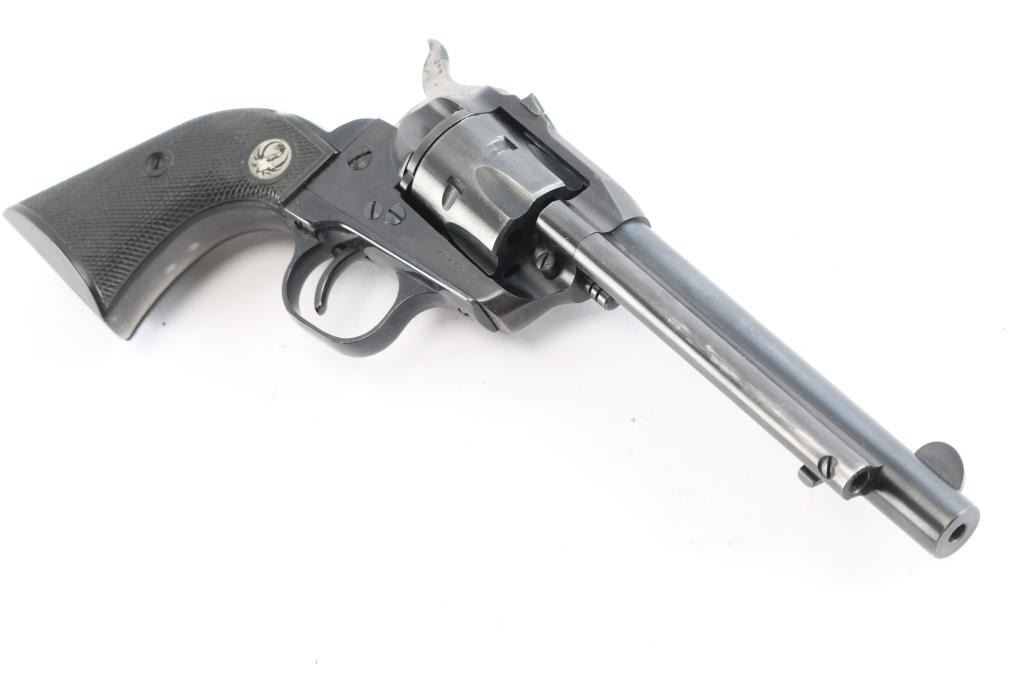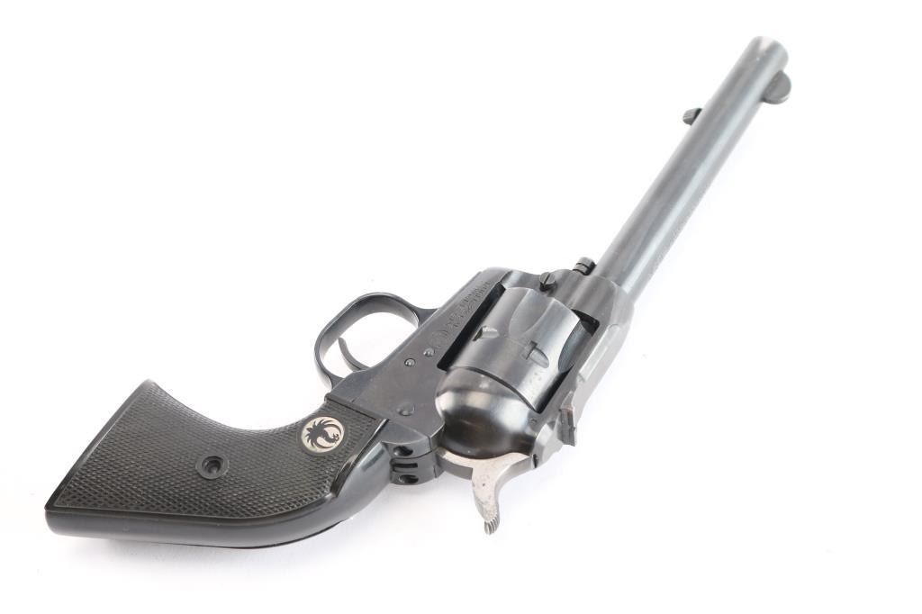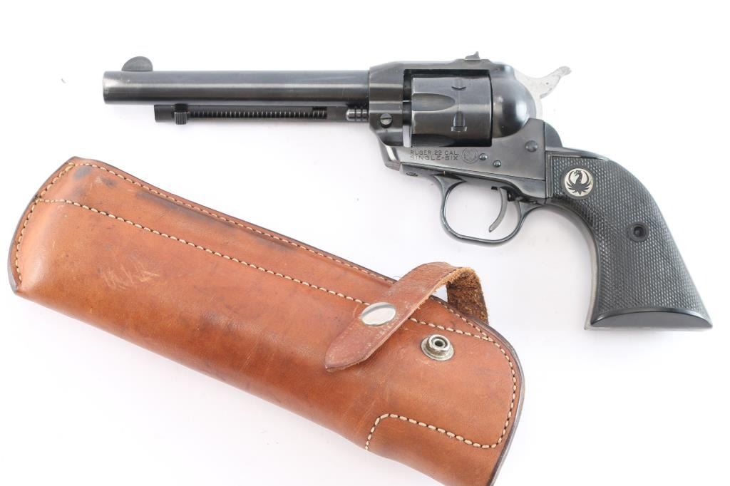 'Flatgate, Three-Screw' model, an American made single-action six-round revolver chambered for .22 Long Rifle, manufactured circa 1955 in Southport, CT. Revolver features a blued finish, a 5.5" round barrel, serrated fixed blade front sight, dovetailed square-notched rear sight, fluted cylinder, flat loading gate, serrated ejector rod button, collard cylinder pin head, external two-toned hammer with serrated spur, smooth grip straps, internal firing pin, and two-piece checkered hard rubber grips with silver-toned Ruger medallions. The original blued finish retained is approximately 88% with holster wear losses on the barrel and on the ejector rod housing, thinning on the grip straps, and light scattered scratches. Metal displays no deformation, but shows light rust spots on the hammer and cylinder. Grips are very good with light scattered nicks and scratches, and the right panel medallion has lost some of the black coloring on the phoenix. Action is smooth and crisp with a tight lock-up. Bore is bright with strong rifling, and the cylinder chambers are also excellent. Revolver includes brown leather Bianchi 'Cross Draw' holster.