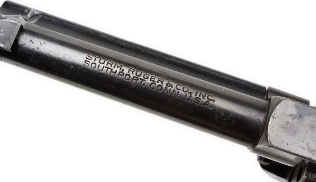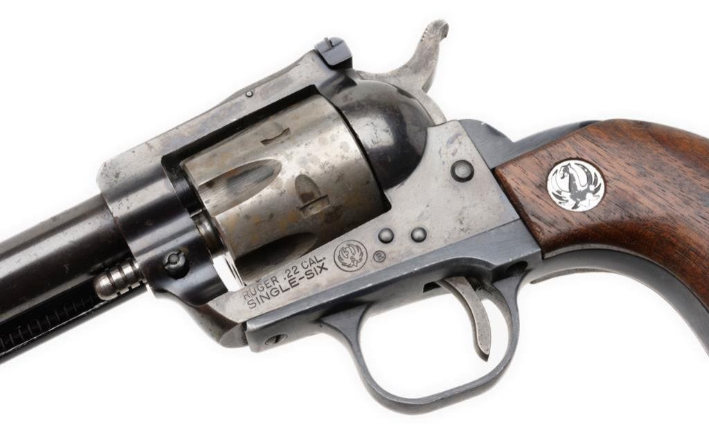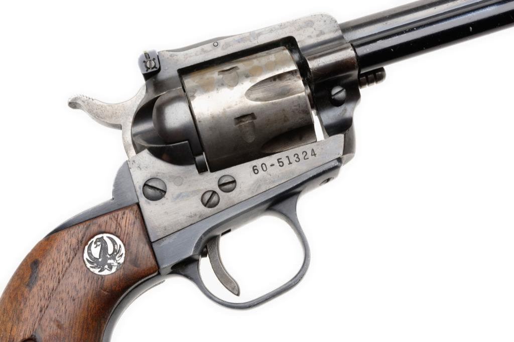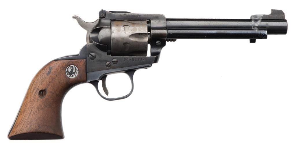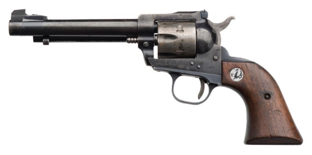 *Ruger Single Six Model revolver, .22 caliber, 5.5” round barrel, S/N 60-51324, blued finish, wood medallion grips in overall good condition with loss of finish to cylinder, some scattered spots of surfaces rust; good action, good grips; bore may clean to good. Est.: $100-$200.