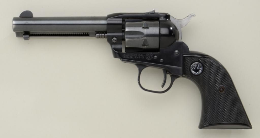Ruger Single Six Model single action revolver, .22 cal., 4-1/2” barrel, black finish, checkered black medallion plastic grips, #211035. This gun is in overall fine condition showing the majority of itsoriginal finish with some slight muzzle wear, fine bore, action, markings and grips. Est.: $175-$350.