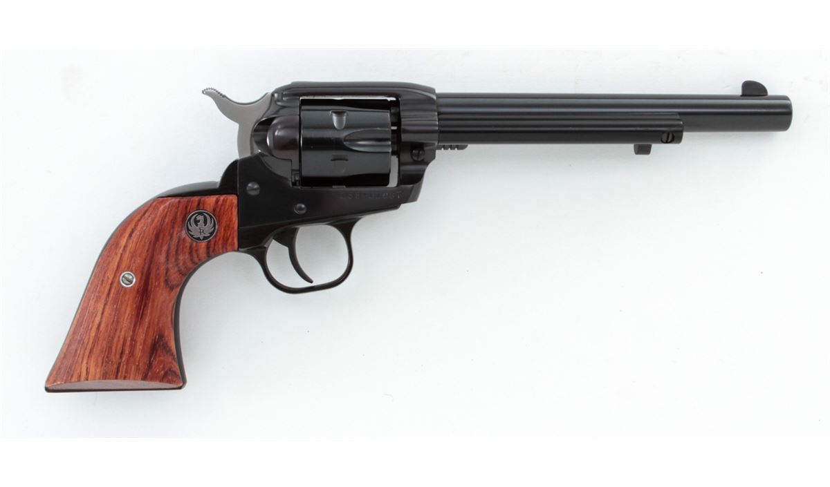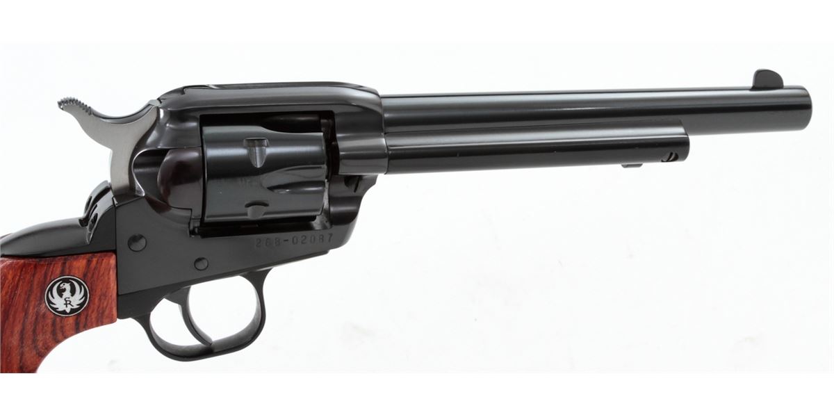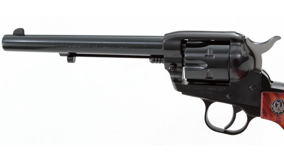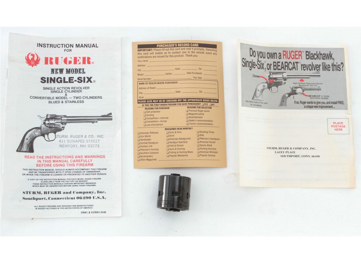 Ruger Single Six Revolver, #268-02087, .22 LR/.22 mag. cal., 6-1/2'' barrel, blue finish, factory hardwood grips. Condition is excellent, appearing as new with light index line to cylinder and one small scratch to underside of barrel. In its original box with extra cylinder and instructions. Est.: $300-$500. (Modern/PPT)