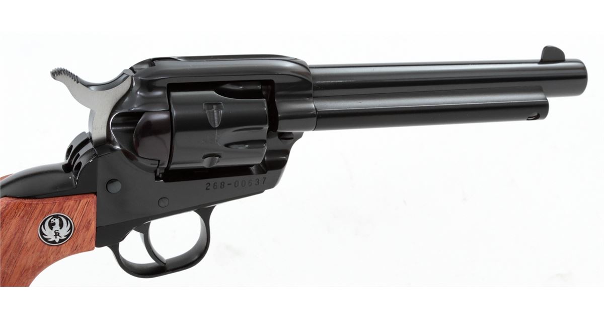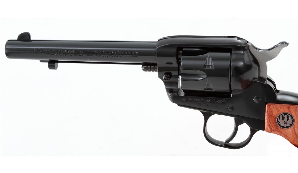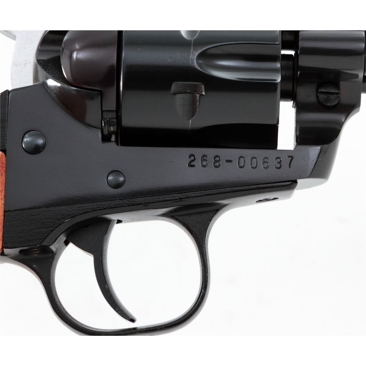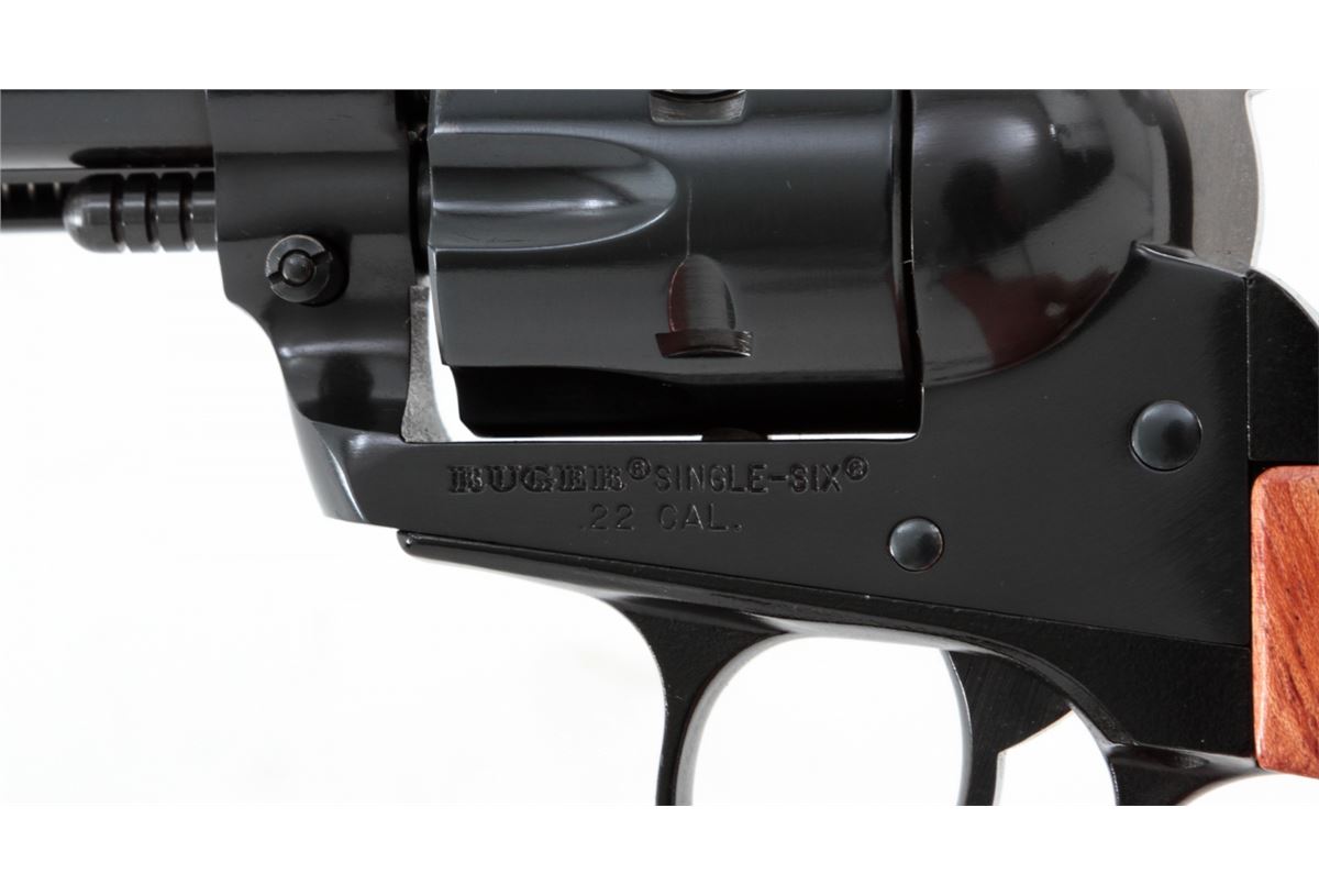 Ruger Single Six Single Action Revolver, #268-00637, .22 LR/mag. cal., 5-1/2'' barrel, blue finish, smooth grips with inlaid Ruger medallions, in original box with matching end label, original owner's manual, and both .22 and .22 Magnum cylinders. Condition is excellent with light index line to cylinder, light overall marks from handling, and some loss to the black finish on triggerguard and grip frame. Action is crisp, bore is bright. Est.: $300-$450. (Modern/PPT)