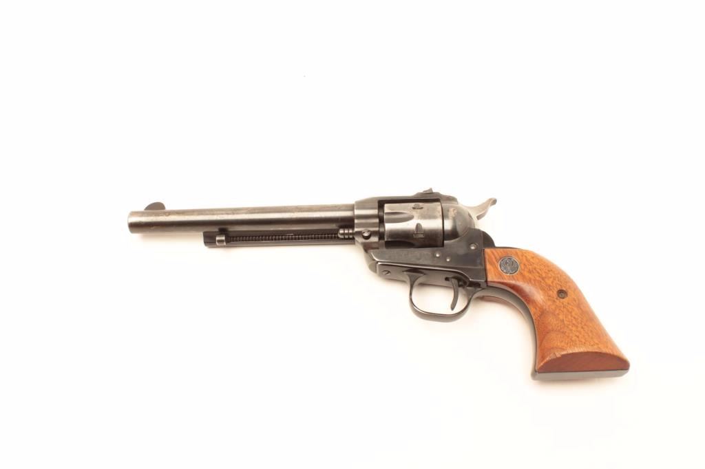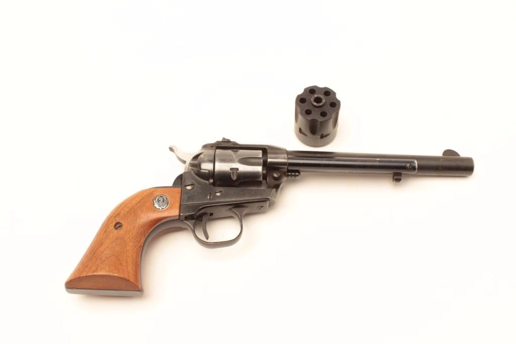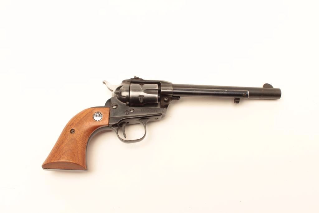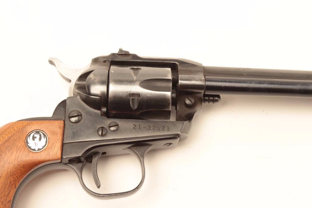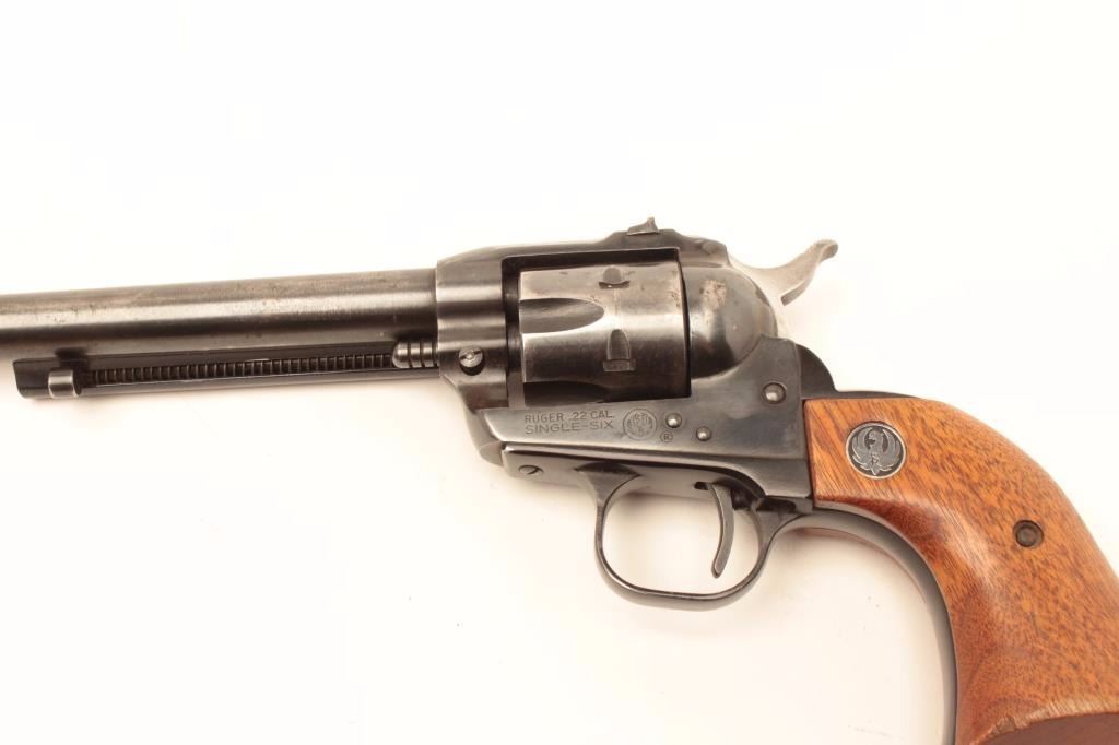 Ruger Single Six revolver, .22 caliber with extra cylinder, 6.5” barrel, blued finish, wood medallion grips, S/N 21-32521, in overall good to very good condition showing considerable original finish with muzzle andhigh point wear, good bore, crisp action, sharp markings and very good grips. (Modern/No PPT). Est.: $200-$400.