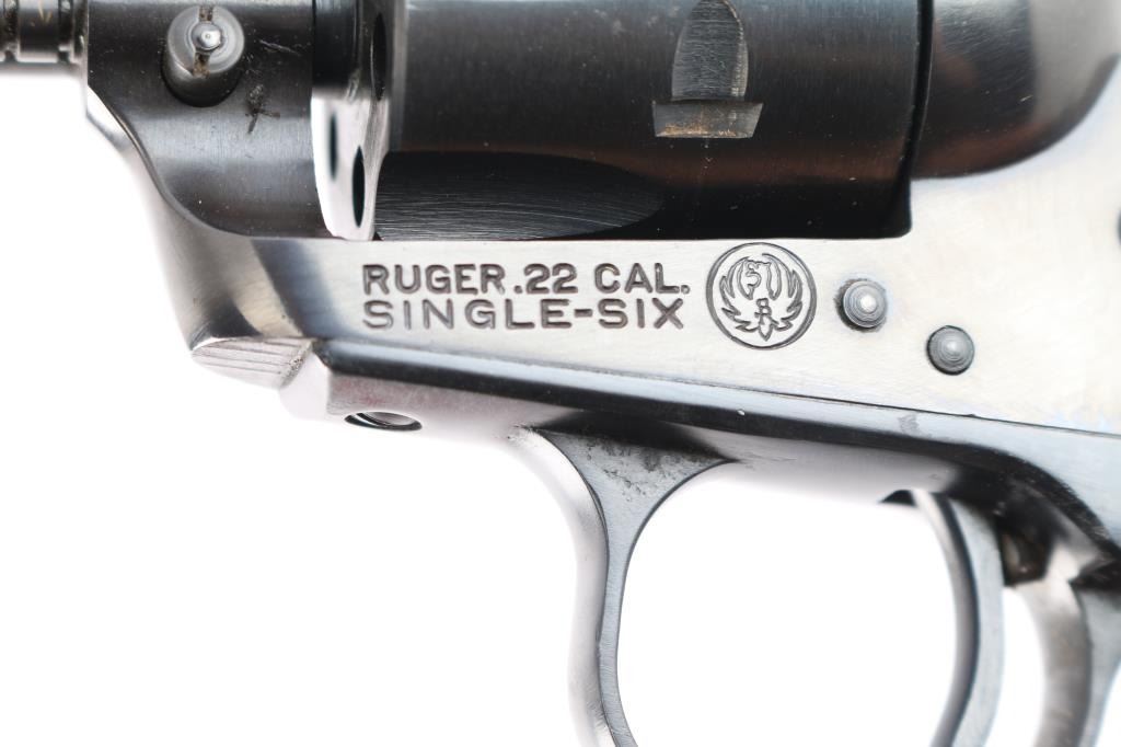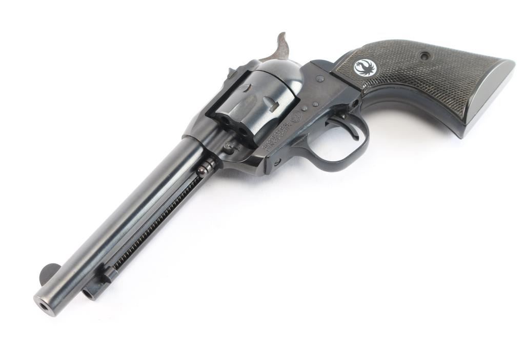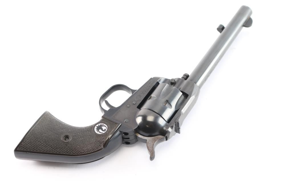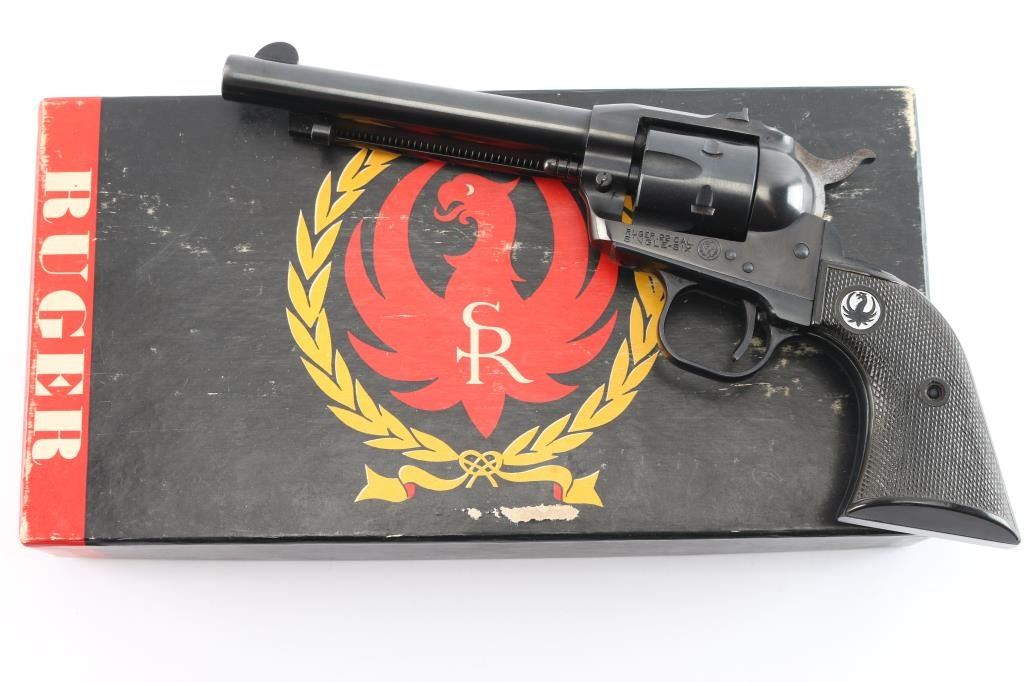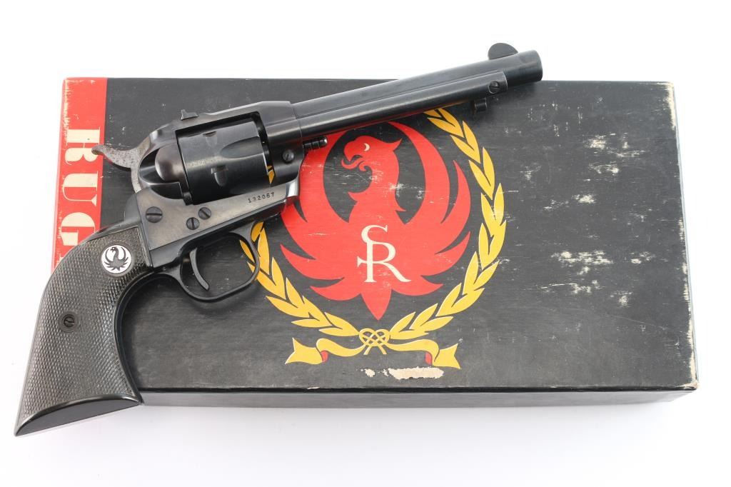 American made large frame single-action revolver chambered for .22 Long Rifle, manufactured circa 1959 in Southport, CT. Pistol features a blued finish, 5 1/2" round barrel, fixed blade front sight, dovetailed notched rear sight, collard cylinder pin head, round ejector rod button, fluted six-shot cylinder, smooth thin curved trigger, two-toned hammer with serrated spur, smooth grip straps, and checkered two-piece black hard rubber grips with silver-colored Ruger medallions. The original blued finish retained is approximately 98% with superficial scratches, and edge wear towards the muzzle. Metal displays no deformation, but shows light scattered rust on the barrel and hammer. The action is smooth and crisp with a good lock-up, and the hard rubber grips are dirty, but excellent. The bore is bright with strong rifling, and the cylinder chambers are excellent. Revolver includes the original black cardboard box, and owner's manual.