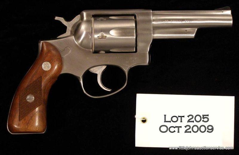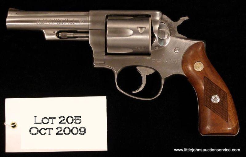 Ruger Speed Six, # 152-32805, .38 Spl., 4" barrel, stainless finish, fixed sights, diamond checkered grips. Revolver is in excellent condition in original red Ruger box with all paperwork. Manufactured in 1976, and marked "Made in the200th Year of American Liberty". Revolver has a thin layer of grease as shipped from the factory. Est. $150-$300.