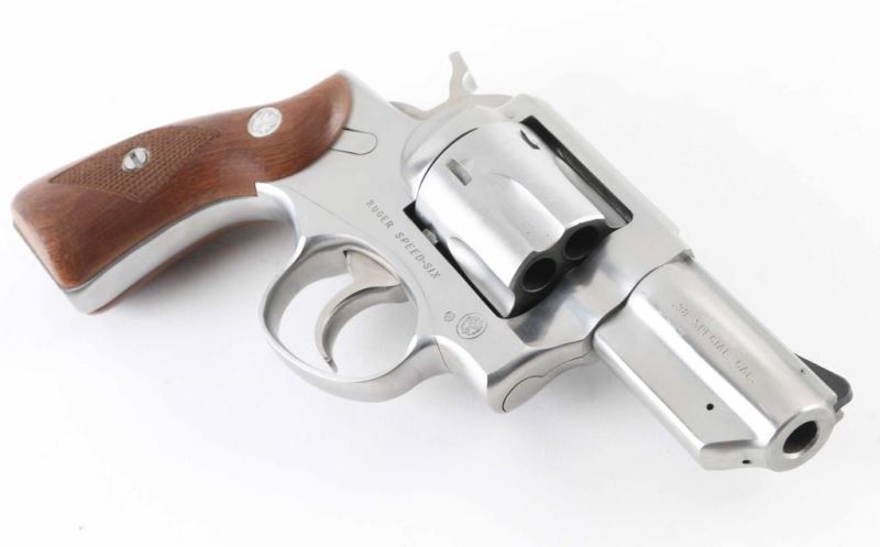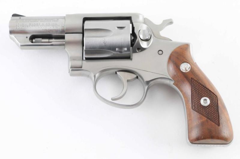 Revolver. Double/Single Action. 6-rd capacity. Produced 1972-1988. 2.75" lug barrel, with pinned serrated front blade, and topstrap square notch. Transfer Bar. Stainless steel. Round butt. Smooth walnut grips with checkered diamond, and Ruger medallions. Action is crisp/tight. Bore and cylinders are excellent/bright. Metal finish has a couple of minor scratches/light tracking on cylinder. Grips are excellent. NRA condition-Near Excellent. Modern Firearm.