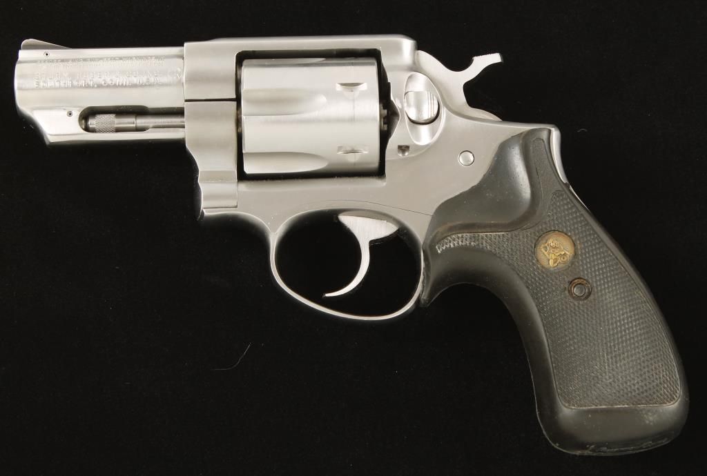 Double action 6-shot stainless steel revolver. 2-3/4" full under lug with serrated top rib barrel. Fixed rear sight and ramp front sight. Good action. Bright bore with good rifling. Black rubber Pachmayr grips. Condition: Good to Very Good with a drag line and a few other scratches. *Modern Firearm*