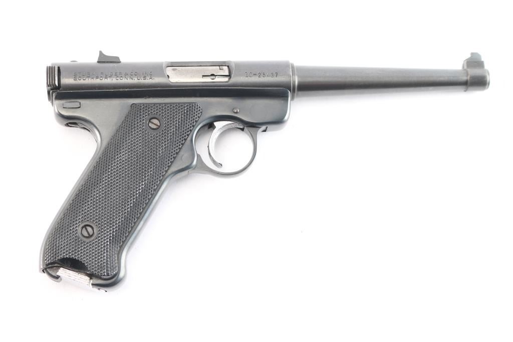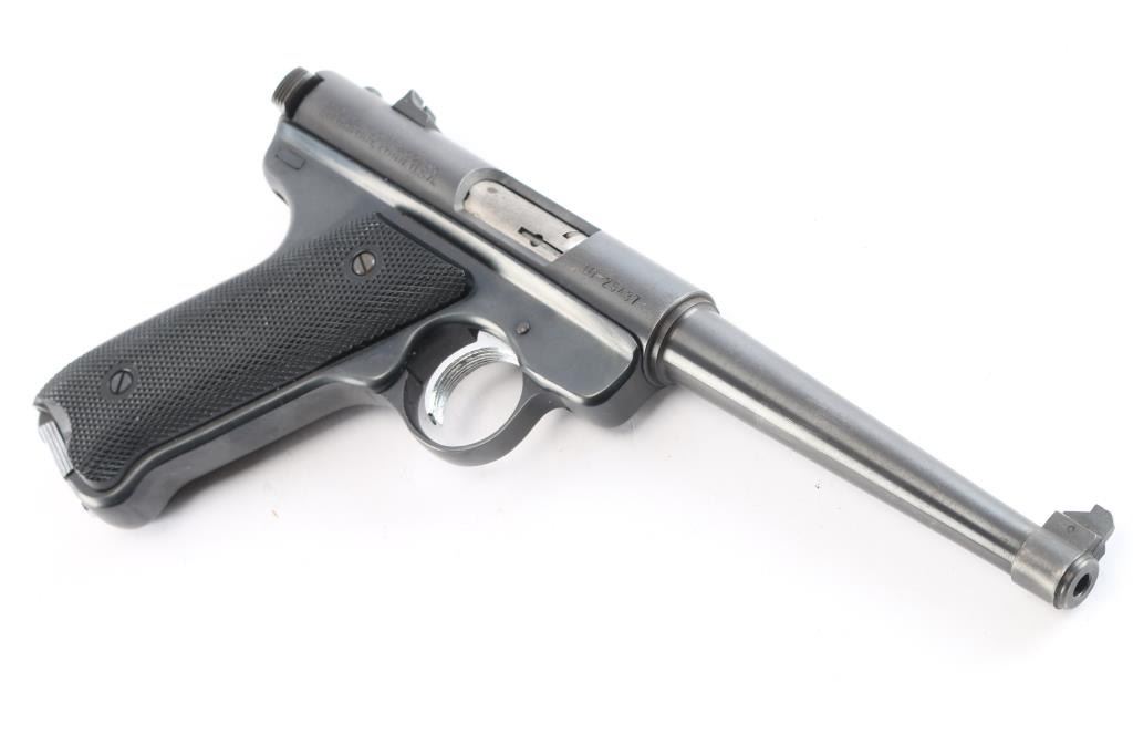 American made semi-auto blued pistol chambered for .22 long rifle ammunition, manufactured circa 1969. It has 6" tapered barrel, partridge front sight, dovetailed rear notch sight, silver tone serrated trigger, checkered black plastic grips with black/silver Ruger medallion on left panel, manual safety (also serves as manual bolt hold open), heel mag release. Bore is excellent/bright. Retains about 95% blued finish with minor scratches. Grips are excellent. Includes one magazine.