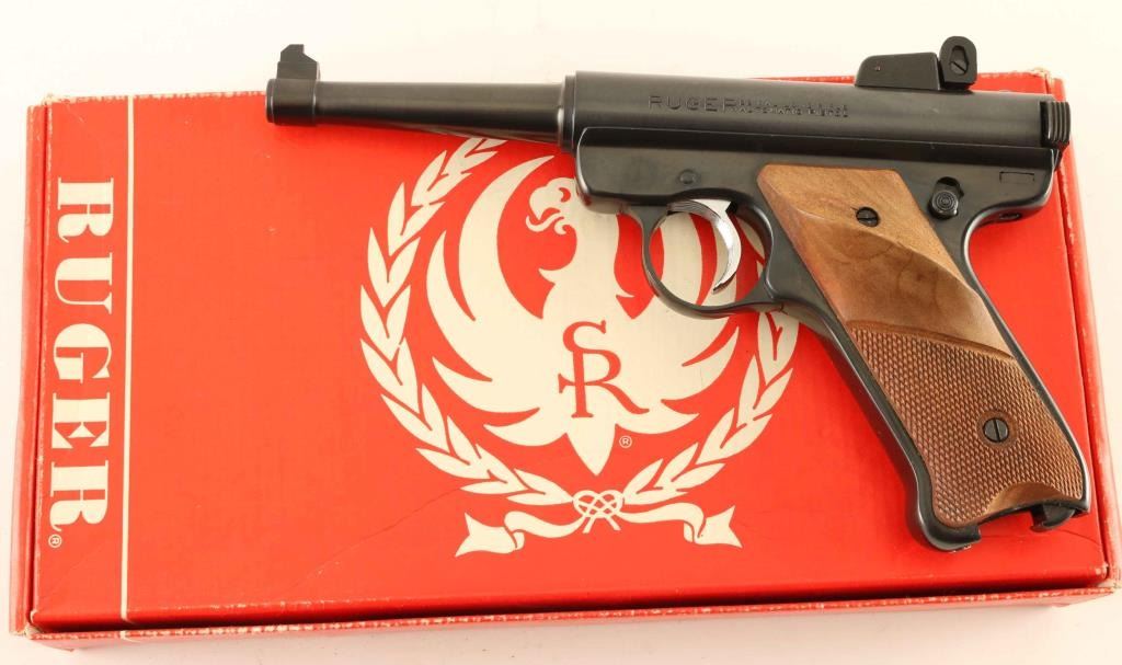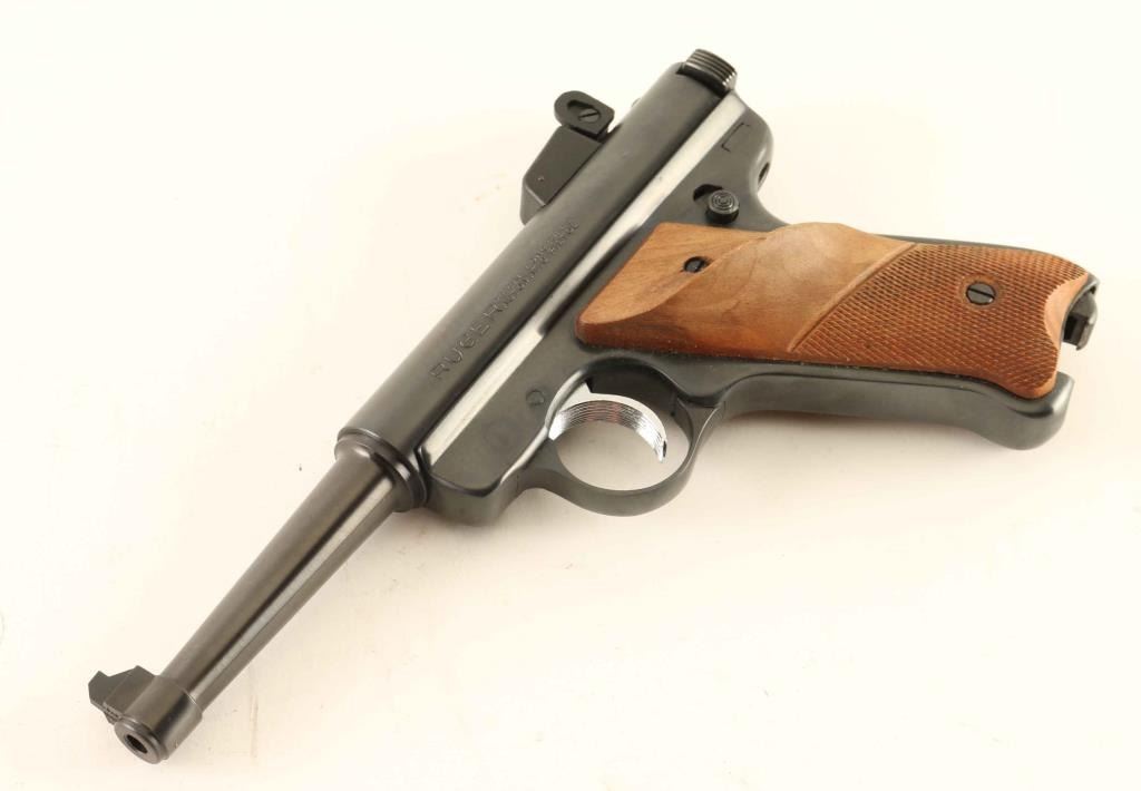 Semi-automatic pistol. 98% blued finish, with wood grips. 4 3/4" barrel. Action is tight. Bore is very good/bright. Adjustable rear sights have been added. Comes with a clear plastic New-line magazine, Comes in the original red factory box, with manual. Some minor scratches on the blued finish. Checkered wood grips show some wear. NRA Condition-very good. Modern firearm.