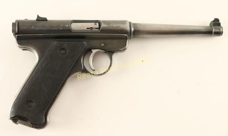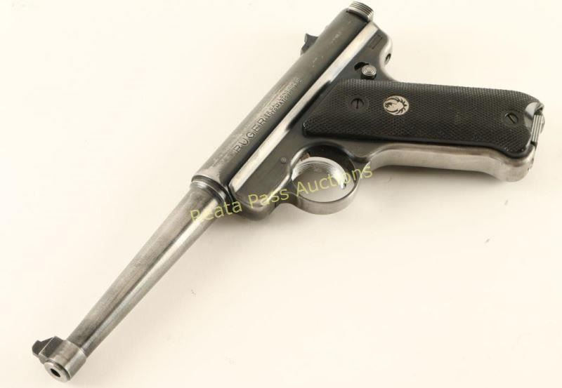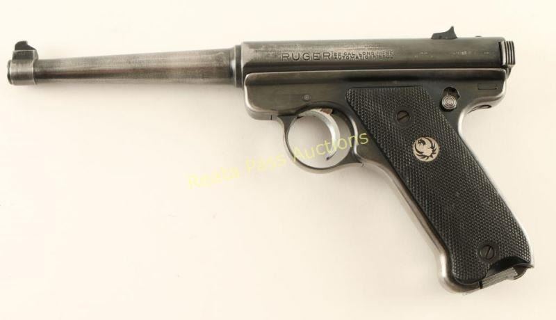 Vintage single action semi-automatic target pistol chambered in .22 Long Rifle, circa 1955. Features a blued finish, 6" tapered barrel, patridge front sight, dovetailed rear window sight, steel frame, serrated chrome trigger, hold open lever/thumb safety, 10 round magazine with chrome floorplate and two-piece checkered black plastic grips with Ruger medallion on the left panel. Pistol exhibits approximately 50% of it's original finish showing heavy holster wear and use that has left the barrel & grip straps primarily in-the-white. Action is smooth, bore is excellent and grips are very good with semi-worn checkering. Condition is good to very good. ***C&R Firearm*** ***Modern Firearm***
