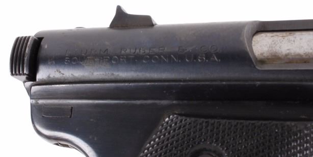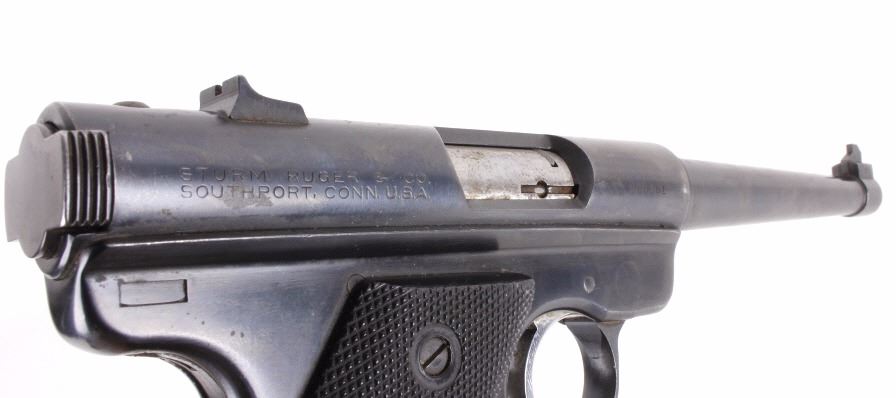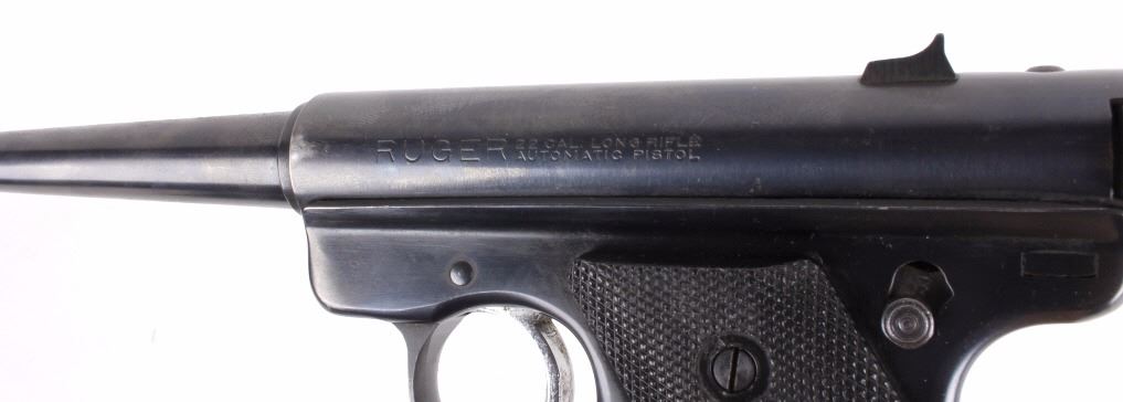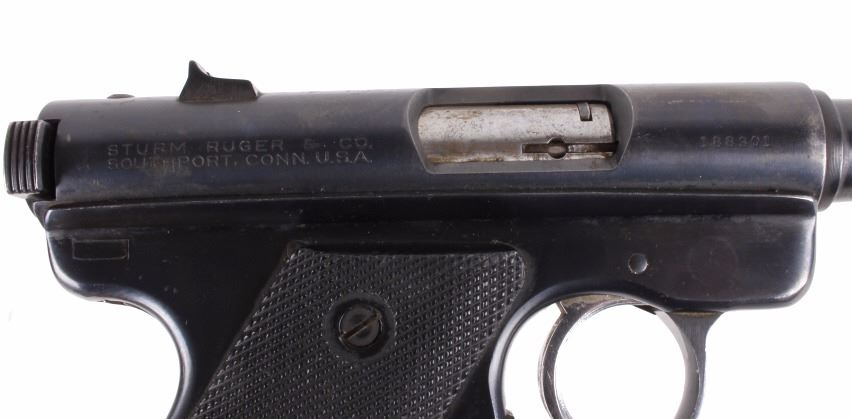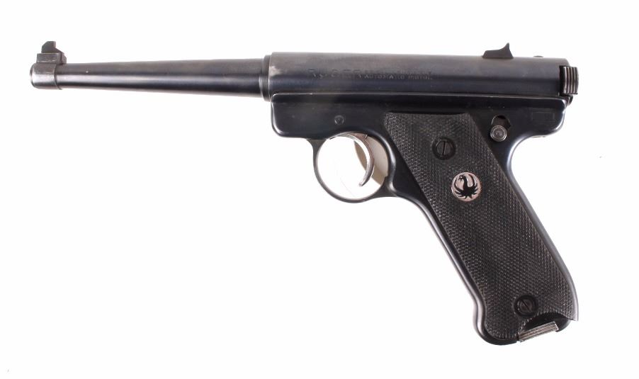 This lot features a Ruger Standard .22 LR semi-auto pistol. The pistol has a blue steel frame, black plastic grips, 6" barrel, and one magazine include in the lot. The firearm dates to the 1956 model year. The Ruger Standard model is a firearm introduced in 1949 as the first product manufactured by Sturm, Ruger & Co., and was the founding member of a product line of .22 Long Rifle rimfire cartridge pistols. It was marketed as an inexpensive .22 caliber rimfire intended for casual sport and target shooting, and plinking. Designed by William B. Ruger, the Standard model and its offspring went on to become the most accepted and successful .22 semi-automatic pistols ever produced. Pistol is in good condition. The pistol shows very good bluing with only minor holster wear. Pistol is in working condition. Measures: 10" L x 6" H x 1" D. Curio & Relic pistol. FFL transfer of NICS background check required. Serial Numbers 1183001.