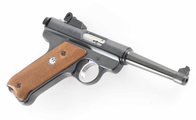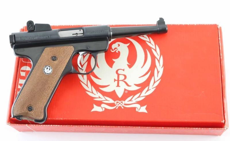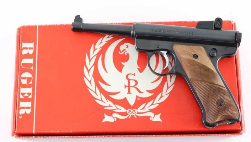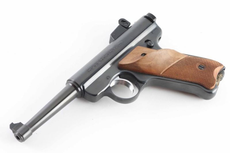 Semi-automatic rimfire pistol manufactured circa 1974. Features blued finish, aftermarket checkered wood grips with right handed thumb rest, 4.75" barrel, blade front sight, adjustable rear sight (aftermarket replacement), manual safety. Does not have bolt hold open feature. Bore is very good condition. Retains 95% blue with minor scratches and handling marks. Grips are very good condition with minor wear. Includes (1) clear plastic Ram-Line magazine, original red factory cardboard box with manual. Condition is NRA Very Good *** Modern Firearm ***