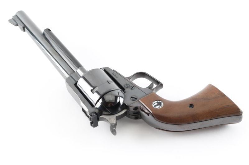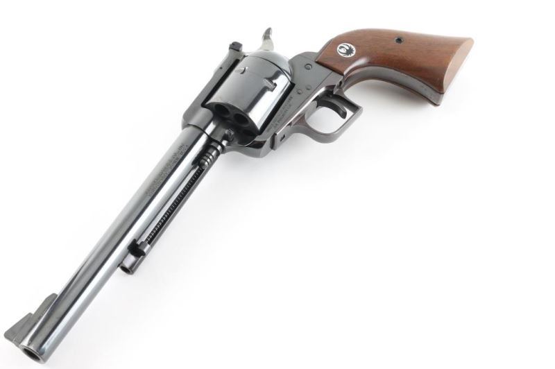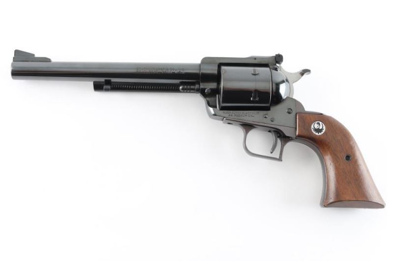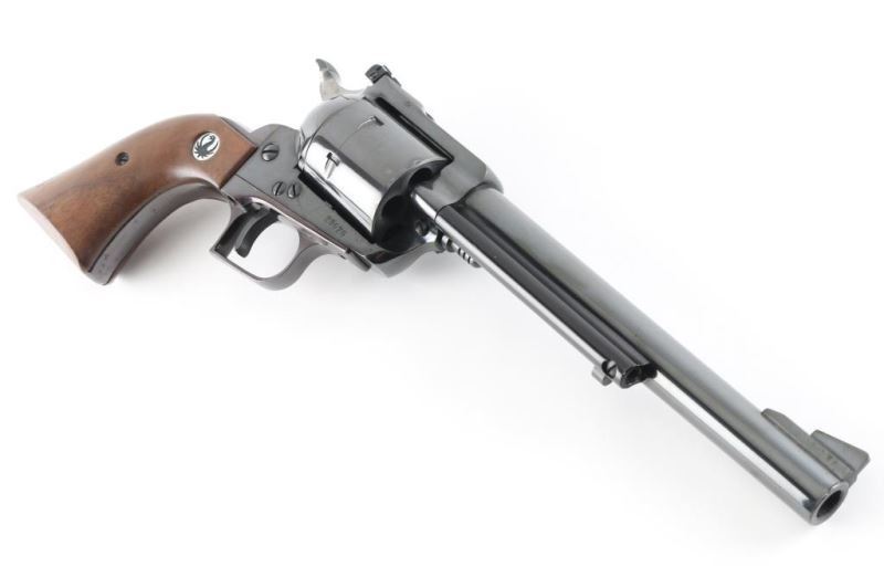 'Three Screw' single action revolver chambered for 44 Magnum, manufactured circa 1965. Features blued finish, smooth wood grips with Ruger medallions, adjustable sights, 7.5" barrel, square back triggerguard, 6 shot unfluted cylinder. Bore and cylinder charge holes are in excellent condition. Finish is 95% smooth dark blue with edge losses, drag line, Grips are very good condition with few dents and scratches. Action is smooth with tight lock-up. Condition is near NRA Excellent ***Modern Firearm***