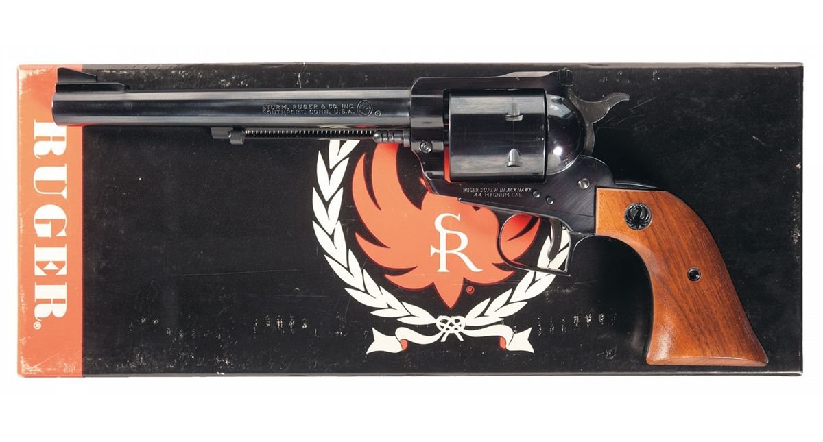 The revolver features the standard barrel and frame markings. Equipped with a raised ramp front sight and an adjustable rear sight, unfluted cylinder, wide target hammer, and square back triggerguard. Fitted with smooth grips with Ruger medallions. Complete with original box numbered to gun and original manual.