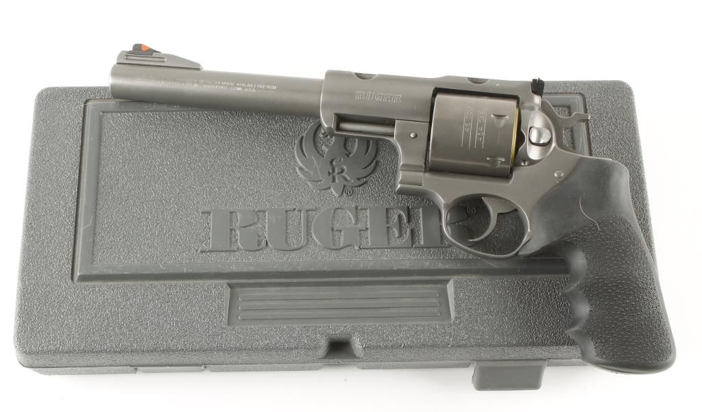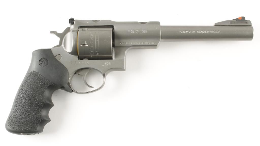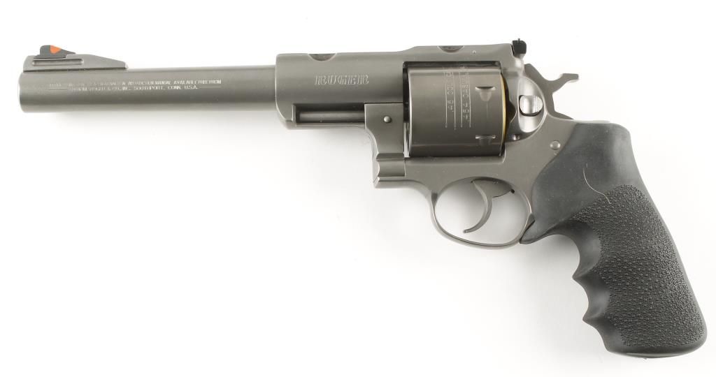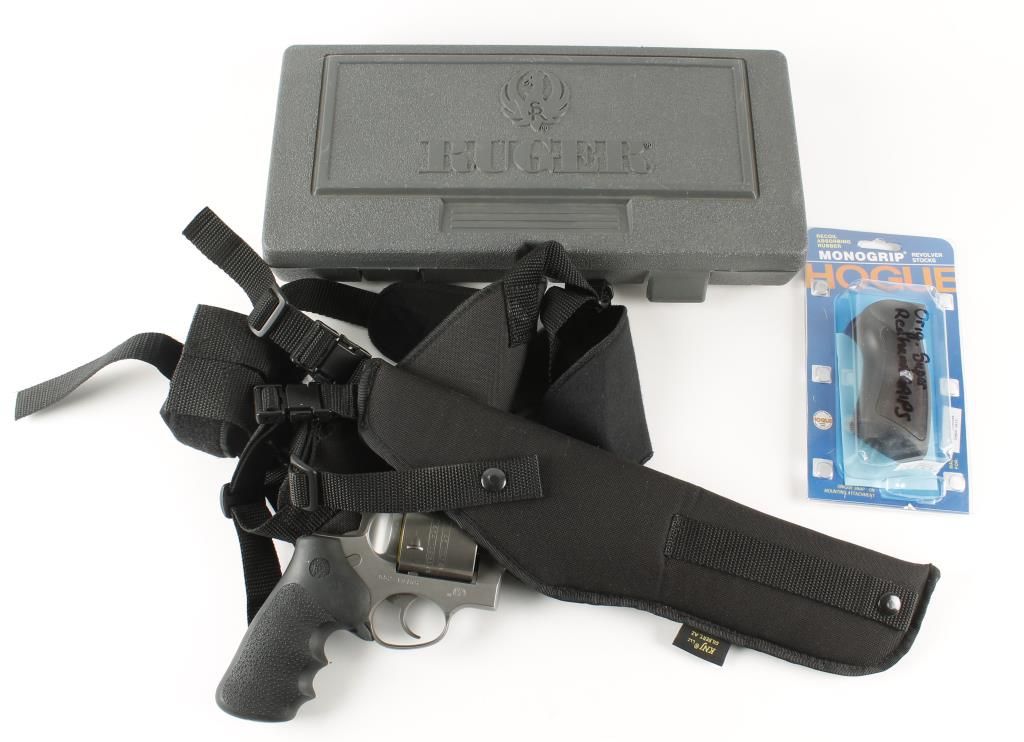 Large frame double action revolver with 7-1/2" barrel. Stainless steel with dull grey finish, pebbled rubber Hogue grips, red ramp front sight and adjustable rear sight. Very good bore and action. Includes original box, manual, original grips and should holster. Condition: Very good to excellent showing very little use. *Modern Firearm*