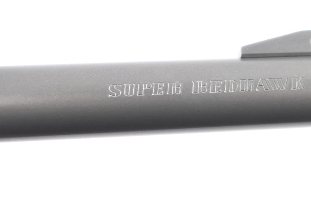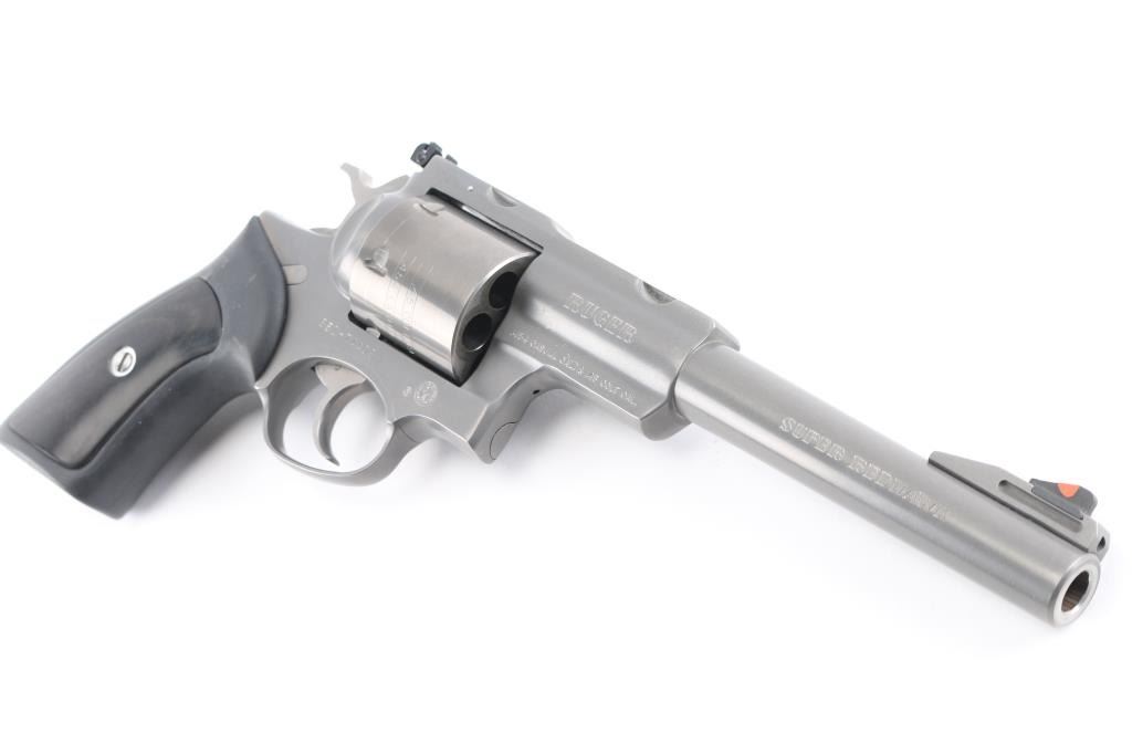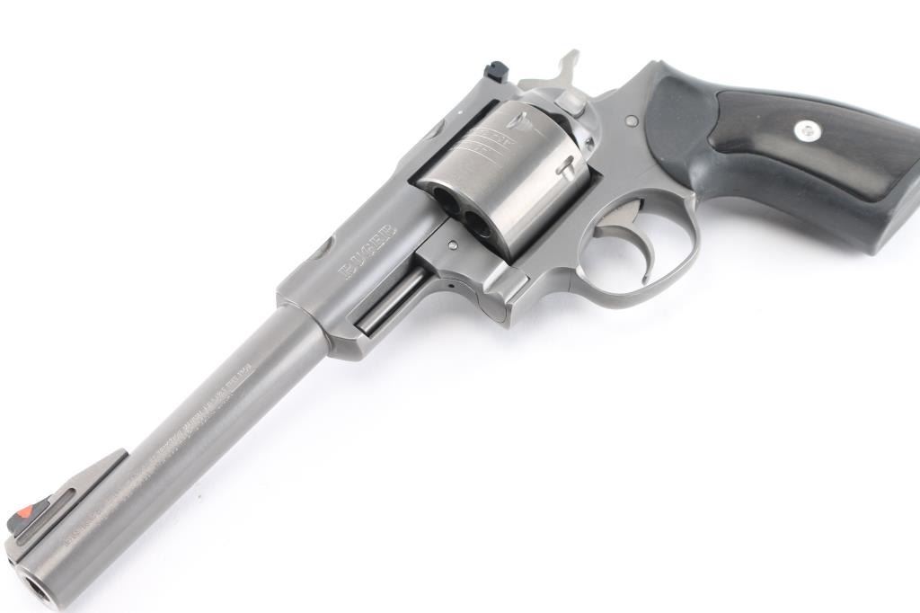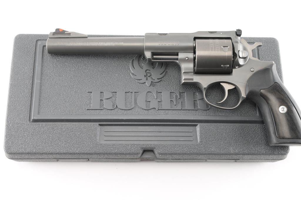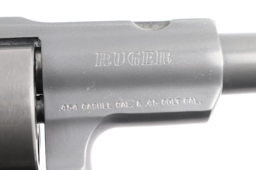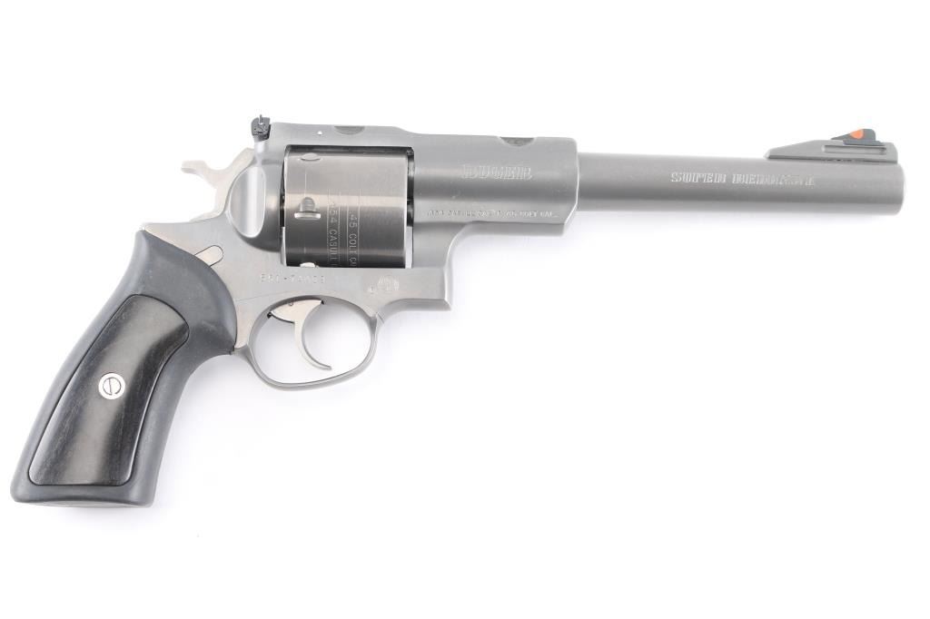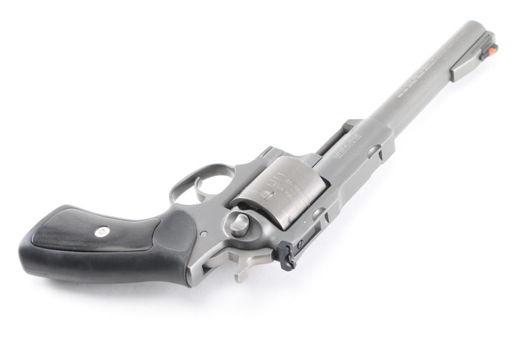 SN: 551-74409 American made large frame double action revolver chambered for .454 Casull & .45 Colt. Manufactured in Southport, CT. Features a Target Grey finish, 7.5" barrel, ramped blade front sight with orange insert, adjustable rear window sight with white outline, non-fluted six shot cylinder, frame cut for scope mounts, smooth trigger, checkered hammer spur and black rubber grip with wood inserts. Pistol shows light wear with a very faint drag line. Action is smooth, bore is excellent/bright. Grip is fine. Comes with original factory hard case, manual, lock & scope rings.
