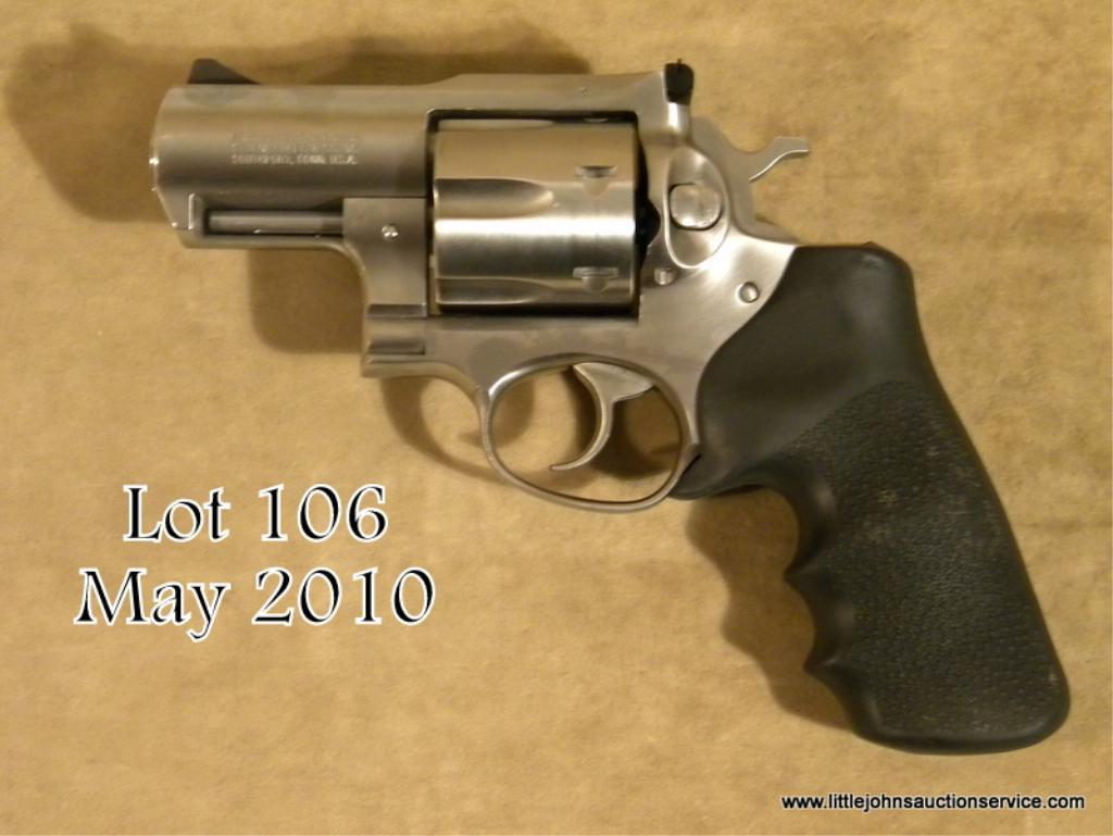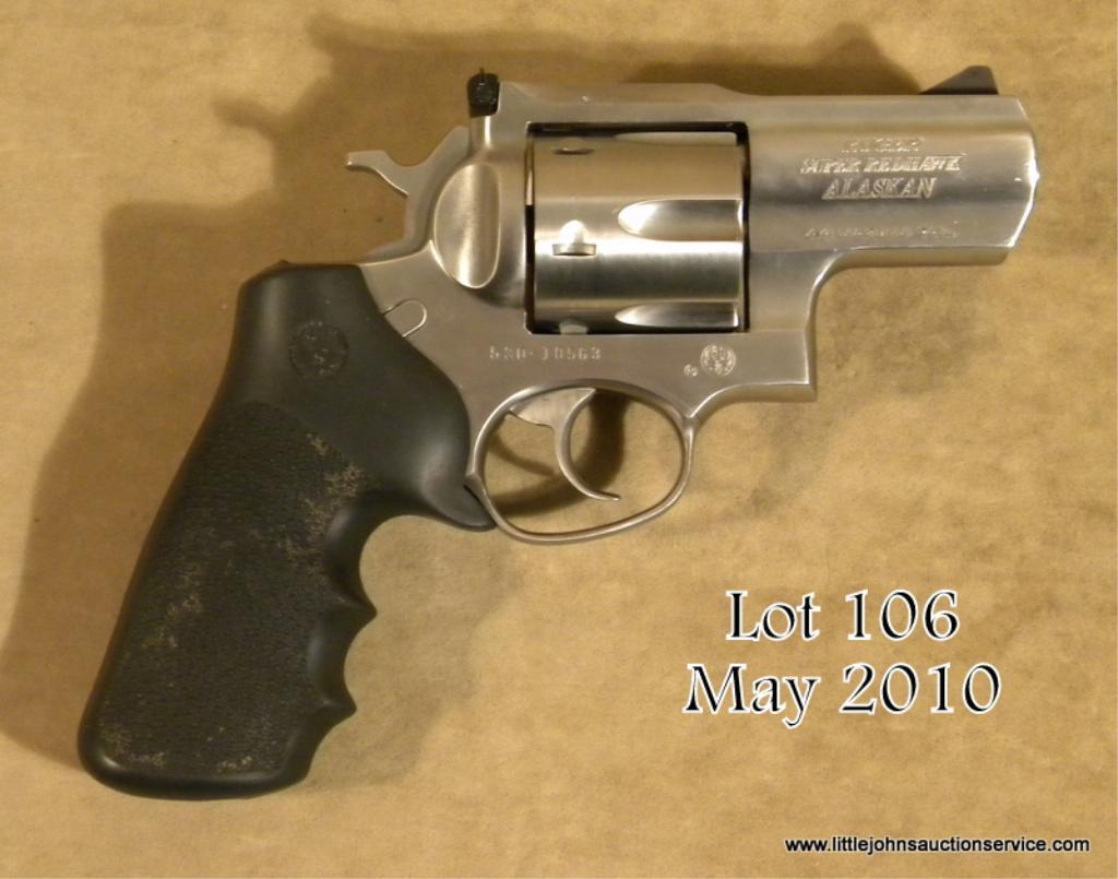 Ruger Super Redhawk Alaskan Model DA revolver, .44 Magnum caliber, 2-1/2” barrel, stainless steel construction, Ruger finger groove combat hard rubber black grips, #530-10563. This gun is in overall excellent condition with an excellentbore, crisp action, white outline rear sight and ramp front sight; very good grips. A massive Ruger that would be a must “last chance” defense weapon in the event of a bear attack on a hunter or fisherman in the Alaskan back country. Est.:$300-$600.