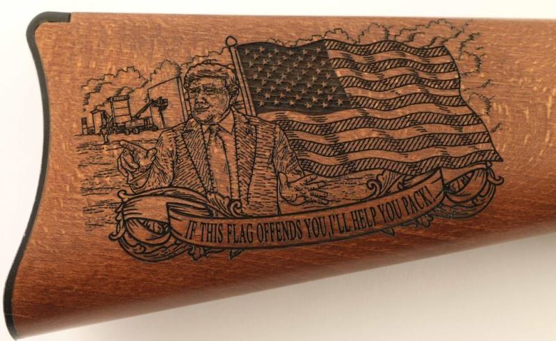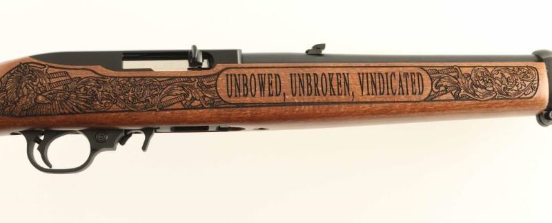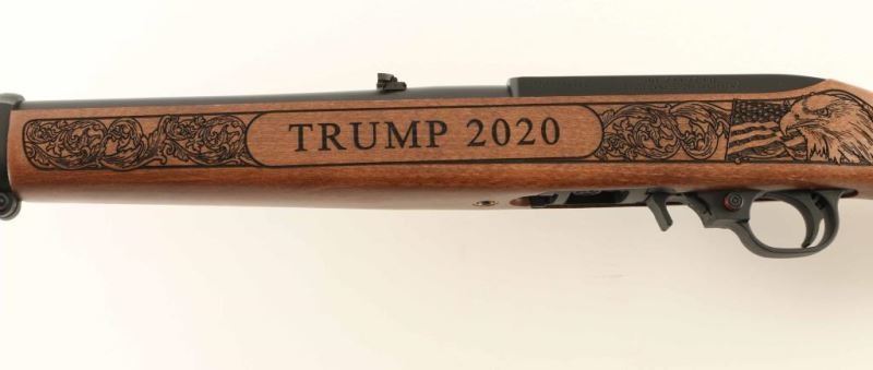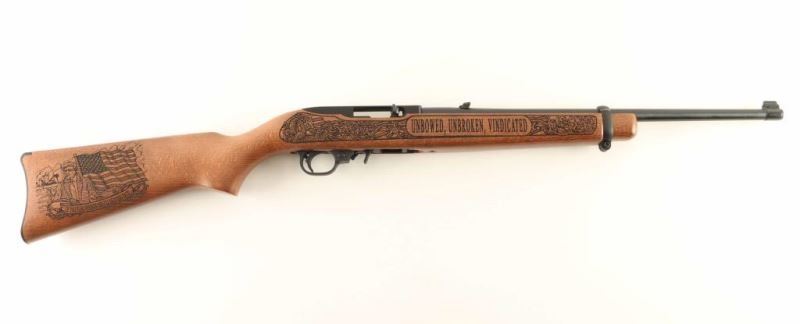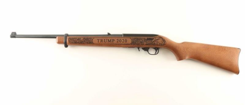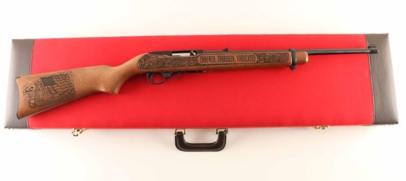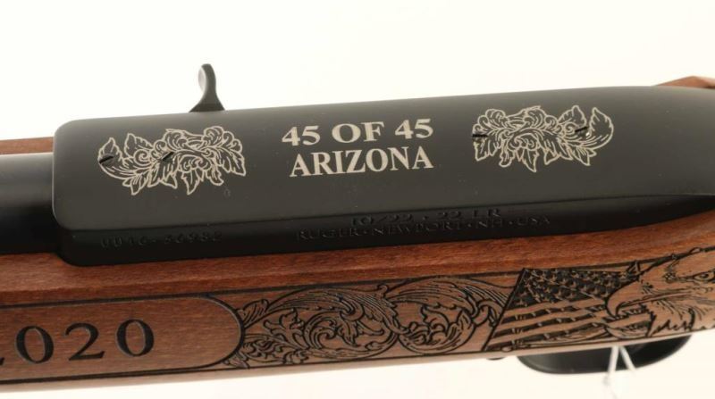 SN: 0016-101413 One of a Limited Edition of only 45 Ruger 10/22 rifles for each US state, commissioned by Heroes and Patriots to honor and commemorate the triumphs over adversity achieved by the 45th President of the United States, Donald J Trump. This "ARIZONA" proofed semiautomatic 22 LR rifle features blued finish, walnut stock, 18.5" barrel, blade front sight, folding adjustable rear sight, detachable magazine, manual safety. Top of receiver is engraved "45 OF 45 / ARIZONA". The sides of the stock are engraved with descriptions and images such as "UNBOWED, UNBROKEN, VINDICATED". Rifle is like new, and comes with luggage style fitted hard case, and factory paperwork. Condition is NRA Excellent - like new *** Modern Firearm ***