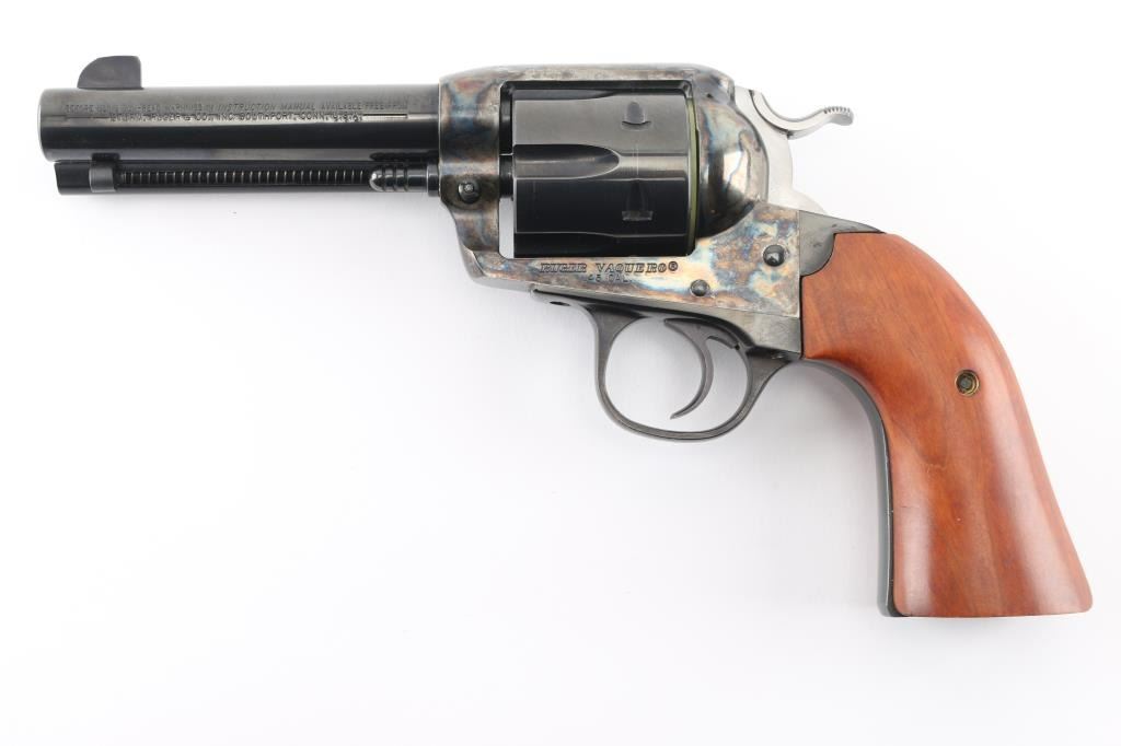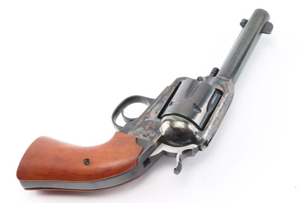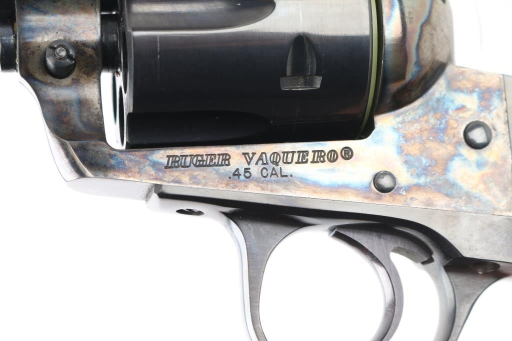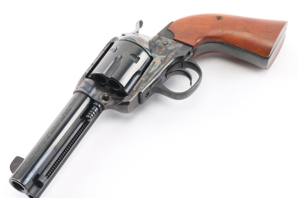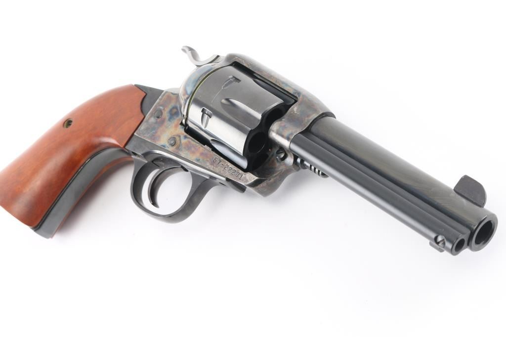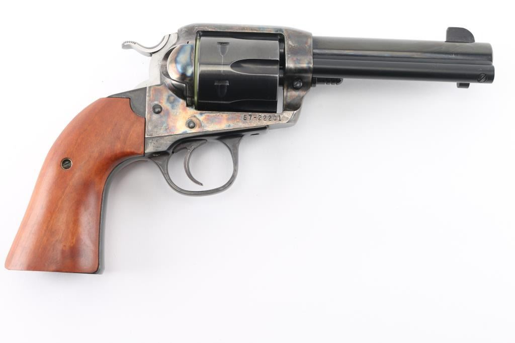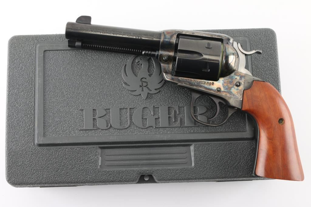 American made single action, 6 shot, revolver chambered for .45 Colt ammunition circa 1999. It features a 4.5" blued barrel and fluted cylinder. Case hardened frame. It has a blade front sight, integral rear sight, smooth blue trigger and hammer with serrated hammer spur. It has two piece smooth wood The Metal finish looks good with a barely visible drag line on the cylinder. Grips are excellent. Bore looks great, bright. Comes with original Ruger grey plastic case, owners manual lock. Condition is NRA Excellent Modern Firearm