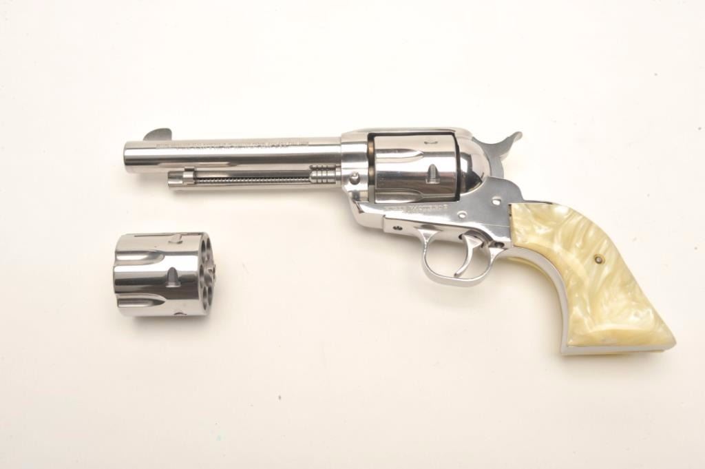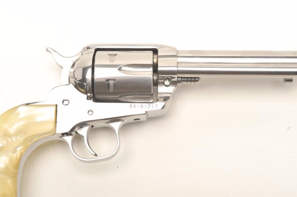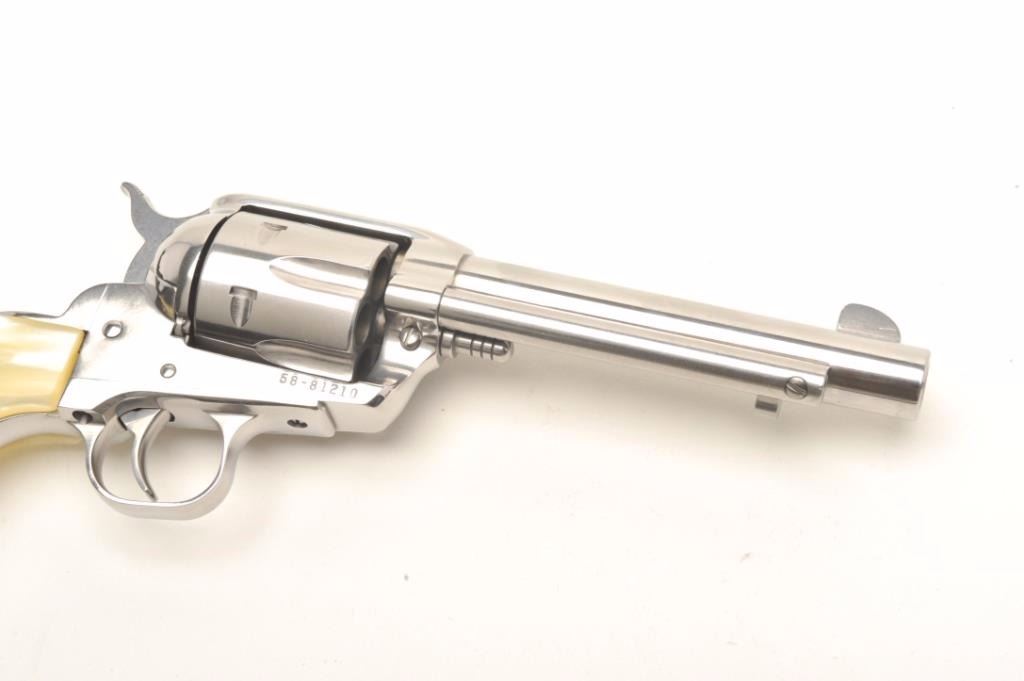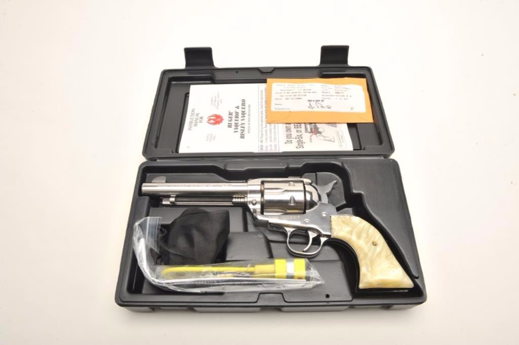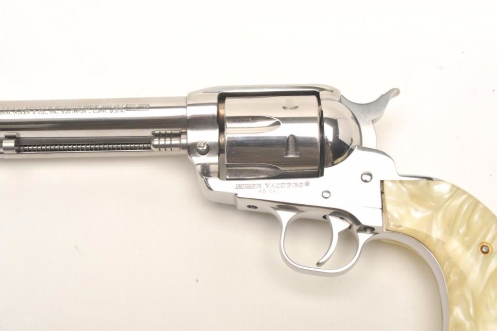 Ruger Vaquero .45 Colt with extra .45 ACP cylinder. #58-81210. 5.5" Bbl, polished stainless finish, pearl-like grips, in excellent to near mint condition. In original case. Est. $350-700. (Modern, PPT)