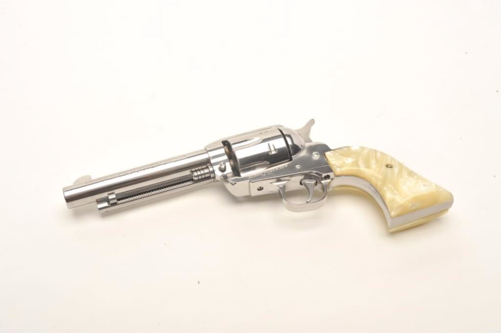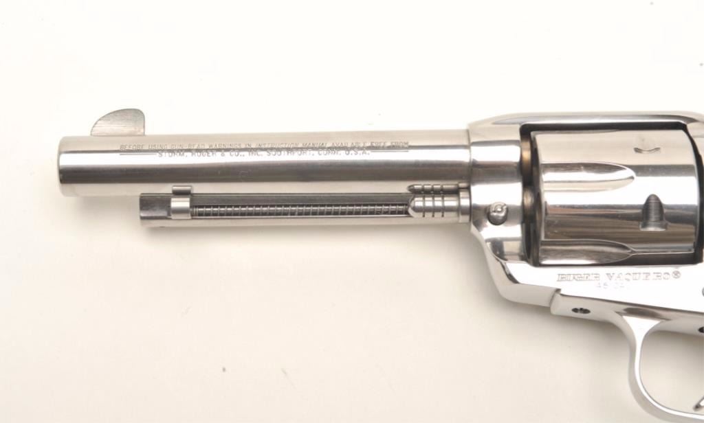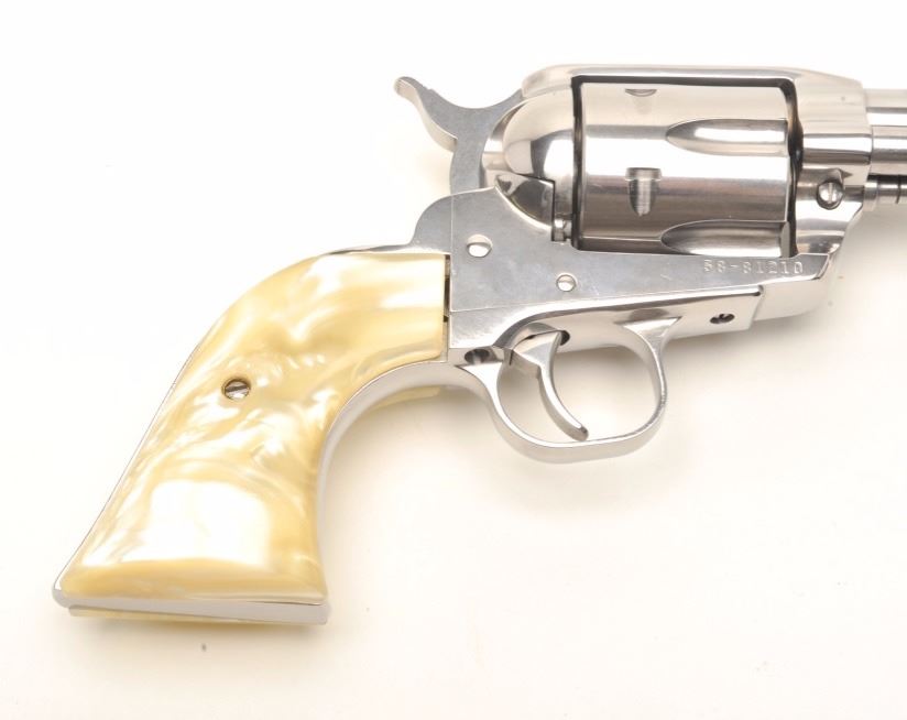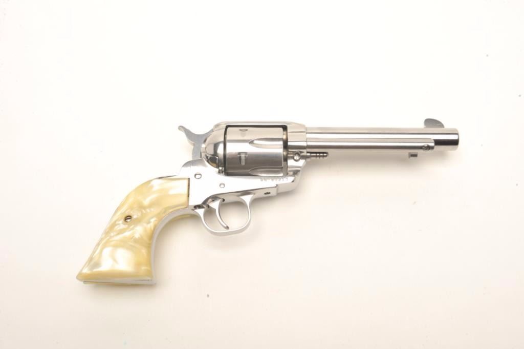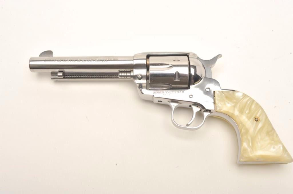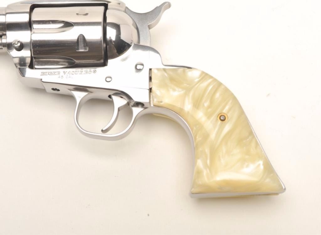 Ruger Vaquero .45 Colt with extra .45 ACP cylinder. #58-81210. 5.5" Bbl, polished stainless finish, pearl-like grips, in excellent to near mint condition. In original case. Est. $350-700. (Modern, PPT)
