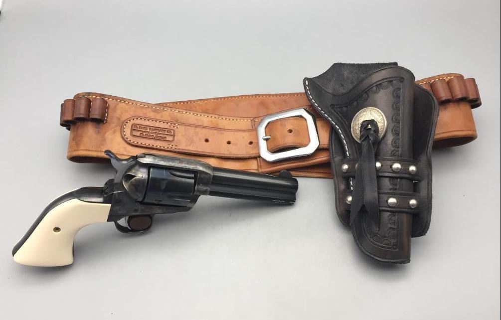 Description: For your consideration we offer this Ruger Vaquero revolver in .45 caliber. This revolver has white, hard plastic grips which give them a look of Ivory and it includes a nice black leather holster with cartridge belt. This one is pretty much identical to (and only a few serial numbers apart) from lot 101. Maker: Ruger. Serial no. 55-15963. Approx. Age: Modern. Size: Barrel measures 4-1/2 inches, Belt measures 43 inches. Condition: Good for their ages, minimal wear expected. Please look closely at the pictures - they are an important part of our description. Shipping: There will be a $15 handling / packaging fee for shipping this lot. The actual cost of postage will be added on top of that. *****This firearm requires an FFL Transfer*****
