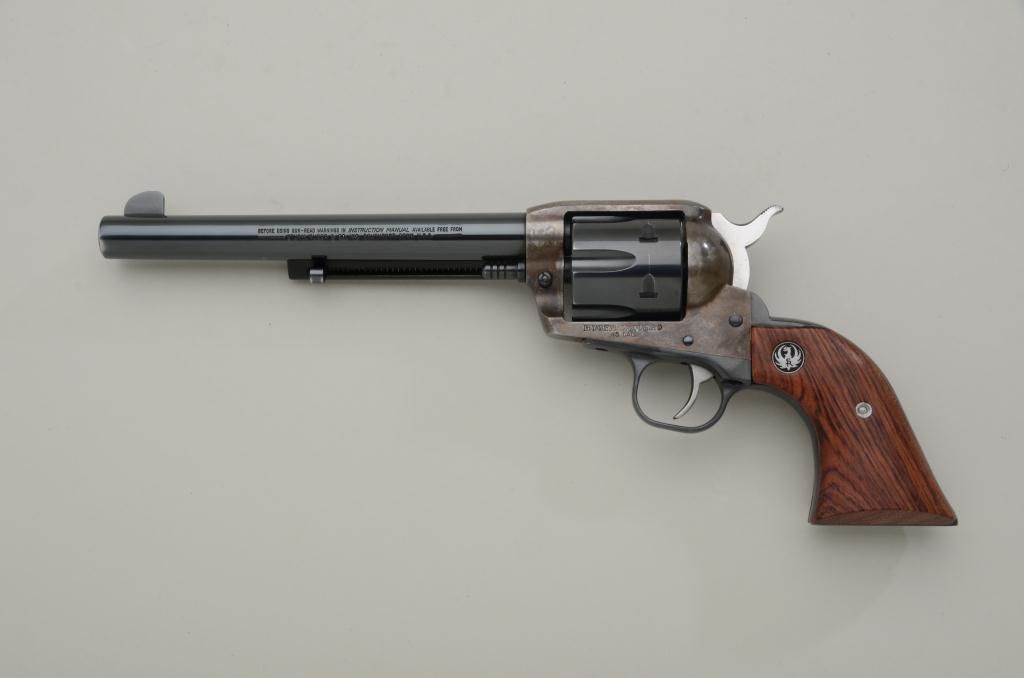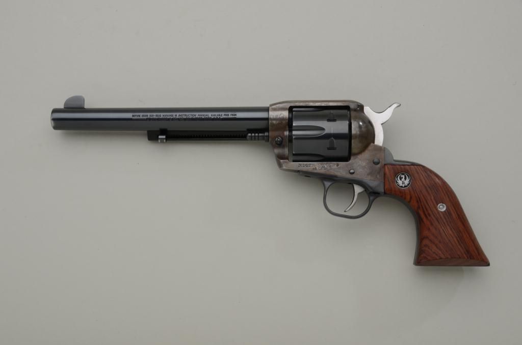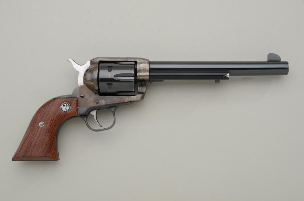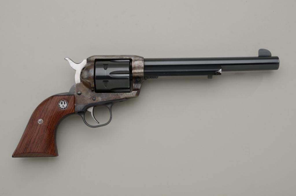 Ruger Vaquero .45 long Colt caliber with 7 ½” barrel, blue and case hardened finish, medallion wood Ruger grips, in early production serial number range 55 – 14005. This single action remains in very good usedcondition showing 80% to 90% original finish with some losses from being carried in a holster. Est.: $350-$700