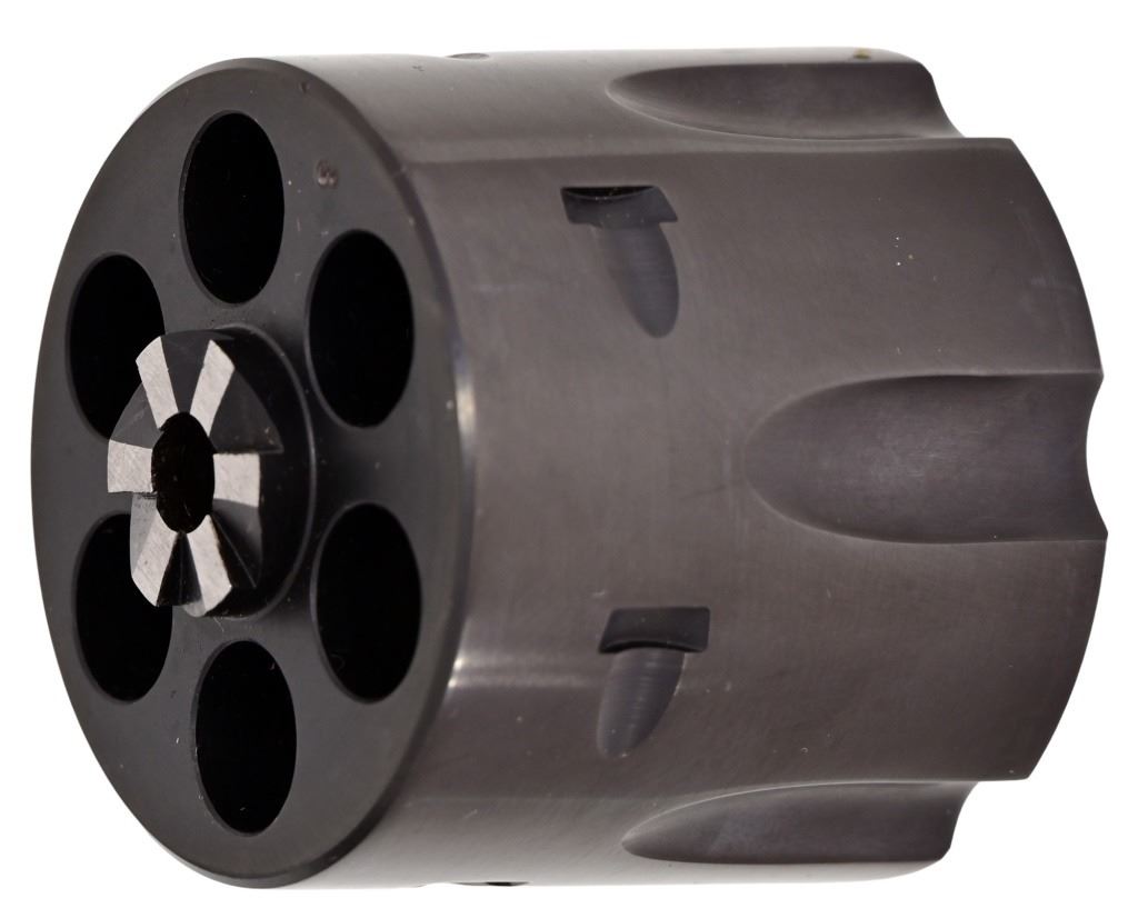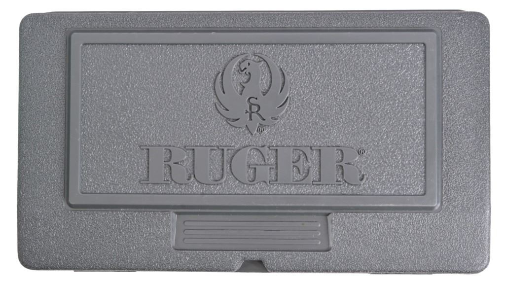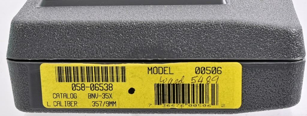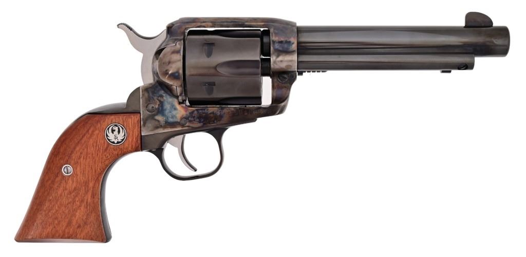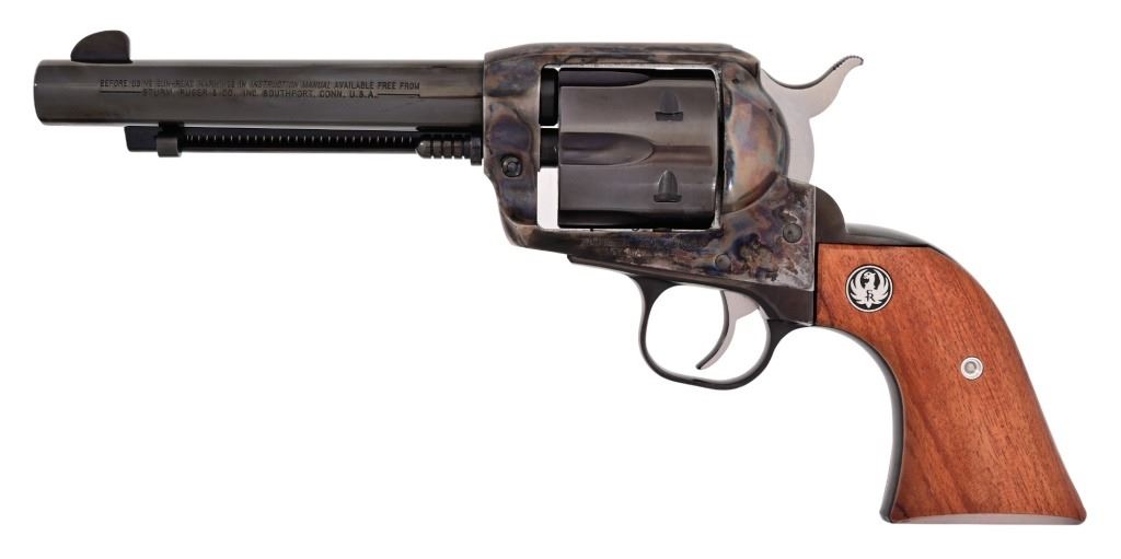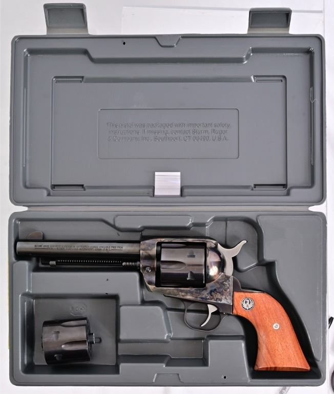 S/N 58-06538. Blue finish 5.5" barrel and cylinder, case hardened frame, Ruger wood grips. Very good condition action and bore. In original plastic case with cylinders for 9mm and .357 Magnum. Modern.