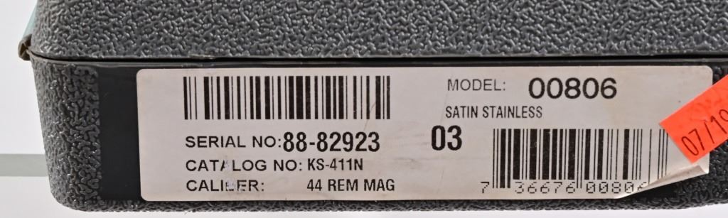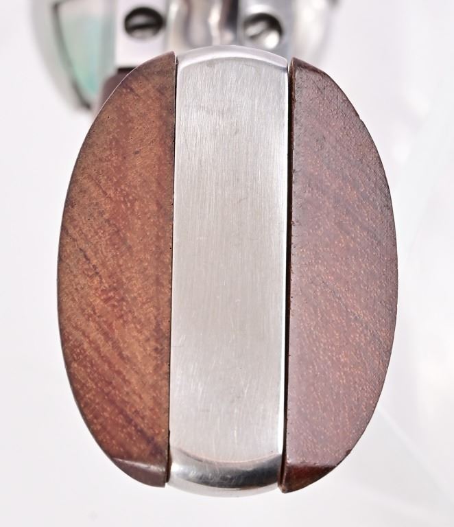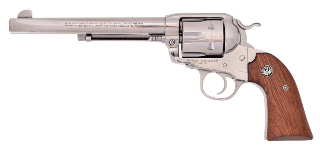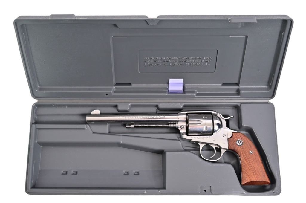 S/N 57-05590. Nickel finish, 7.5" barrel, wood grips. Good condition, in an original style Ruger plastic case. Modern.