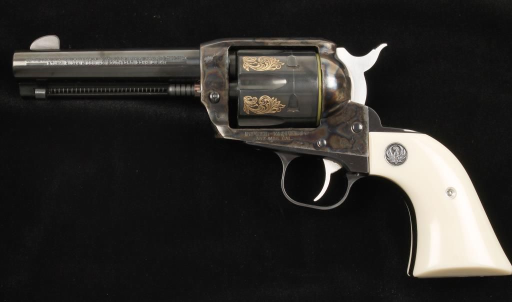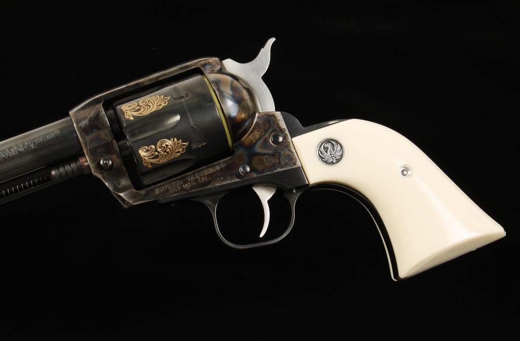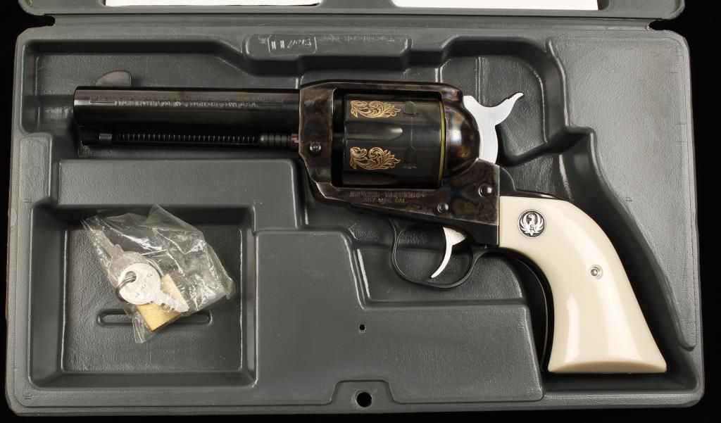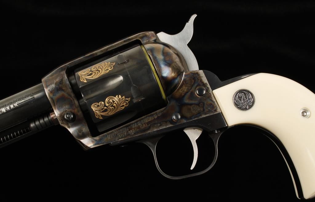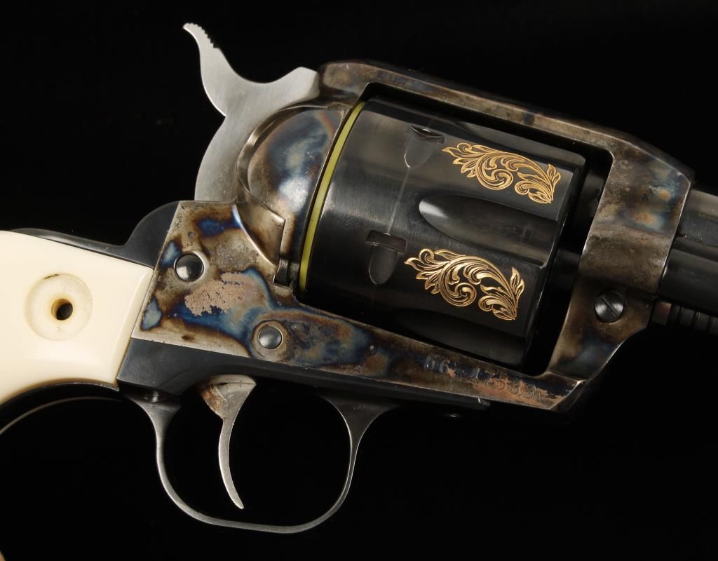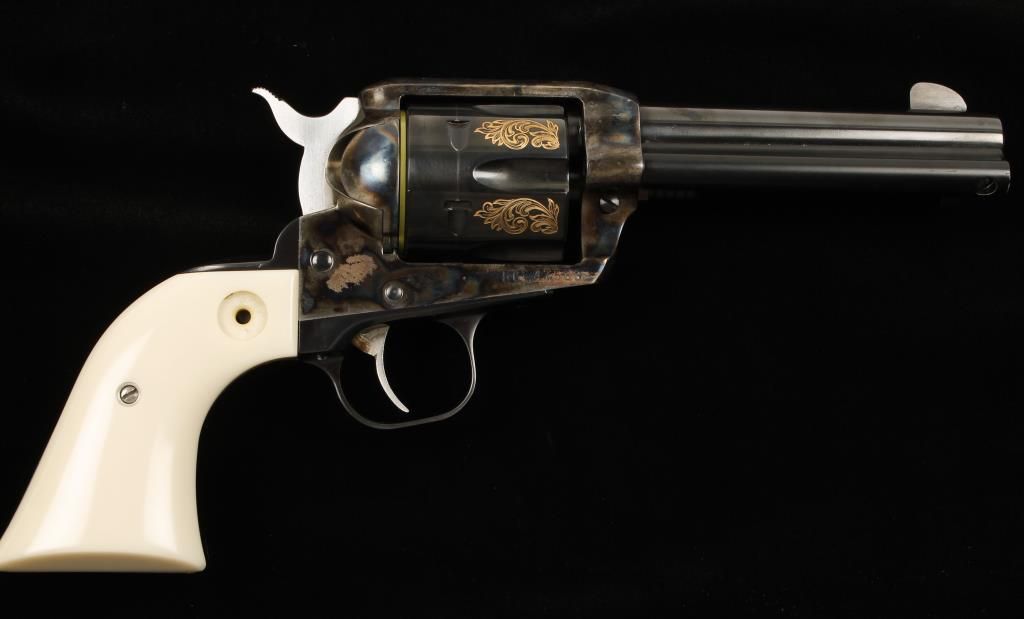 Popular single action 6 shot revolver with 4-3/4" barrel. Case colored frame, blued barrel, cylinder and trigger guard, faux ivory grips, gold inlaid scroll engraving on cylinder, bright finish on hammer and trigger. Very good bore and action. Includes original box and manual. Condition: Very good showing light use. Right grip panel is missing the Eagle medallion and right side of frame shows blemish in case coloring. *Modern Firearm*